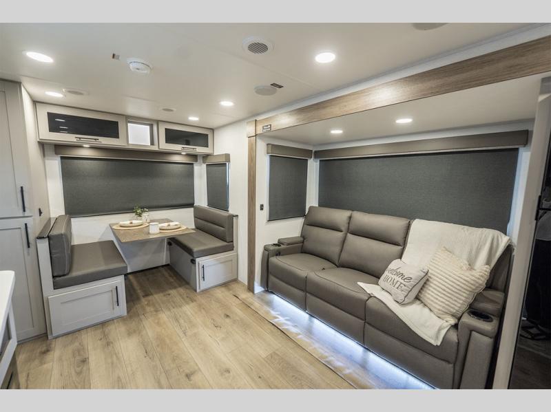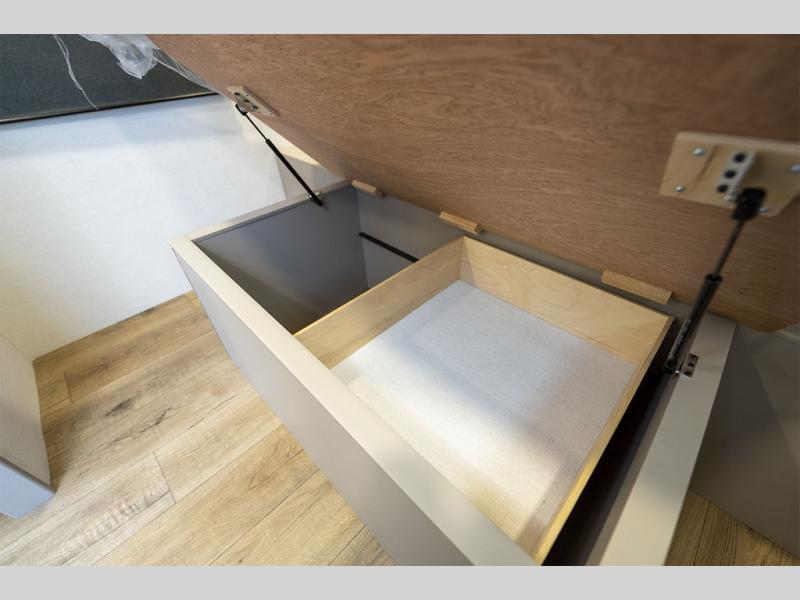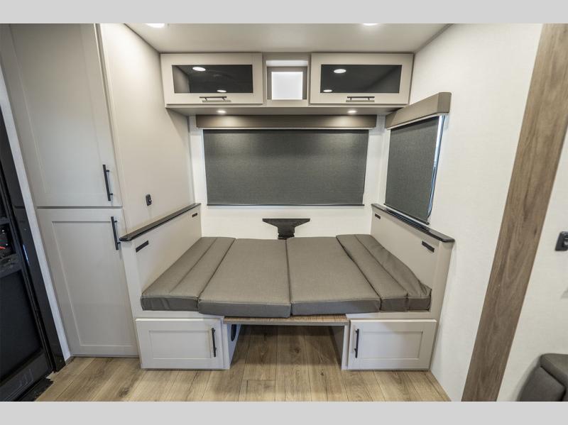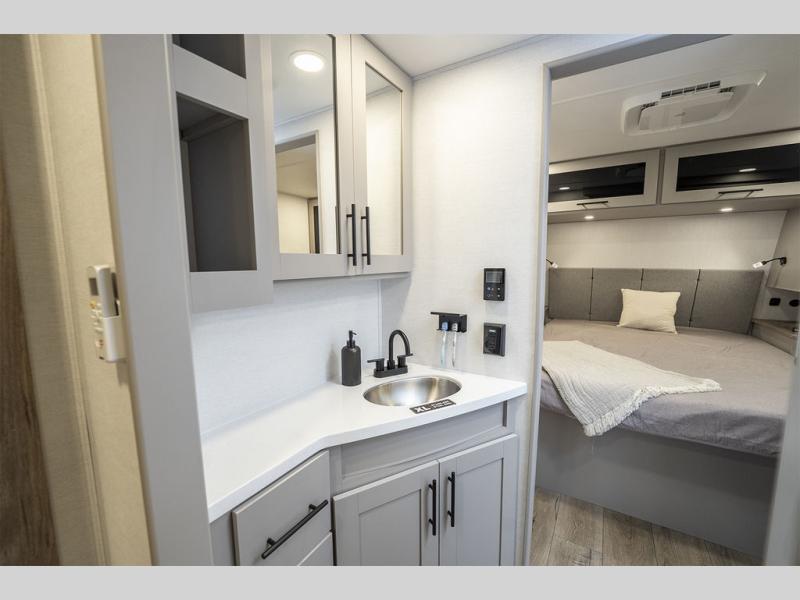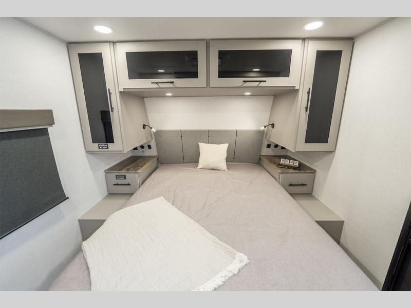 Grab your hiking boots and your sense of adventure for fun camping trips in this single slide out travel trailer. The rear booth dinette includes overhead storage for your things and the sofa slide out is in great view of the 40" HDTV. There is also a fireplace here that will make your space feel more like home plus more storage space, including a pantry with pull out trays and storage above the 10 cu. ft. 12V refrigerator. A walk-through bath will take you to the front master bedroom with a queen bed, wardrobe nightstands, plus its own exterior entry door!