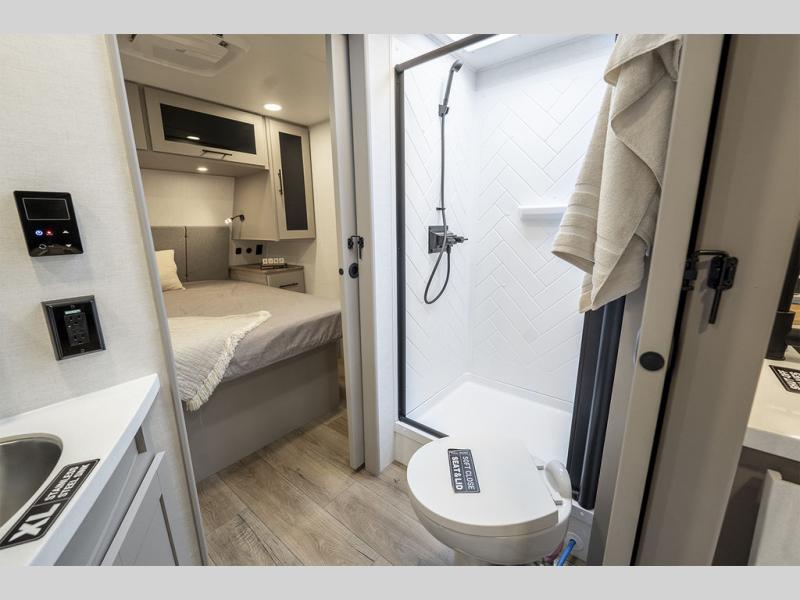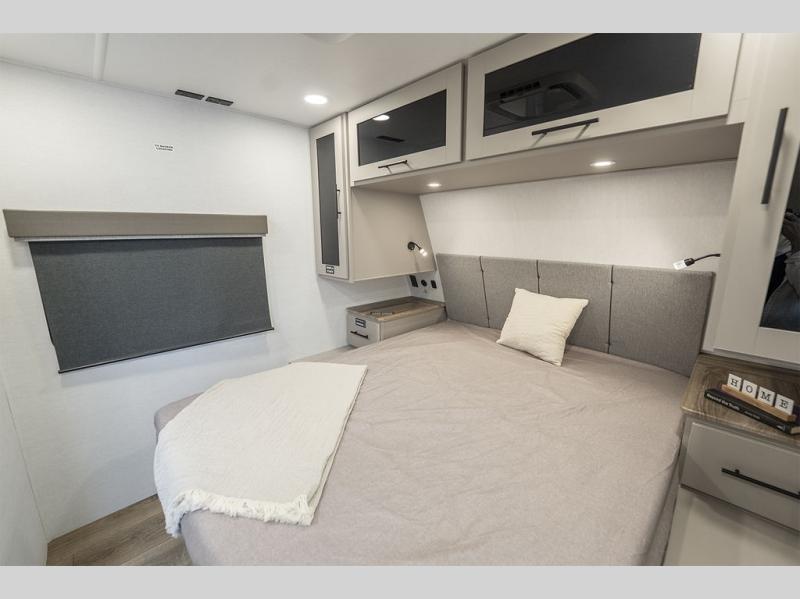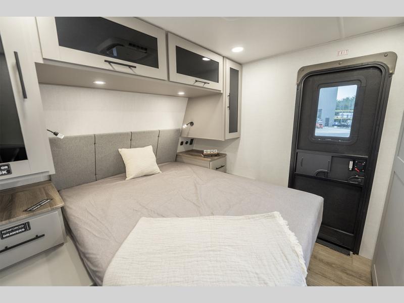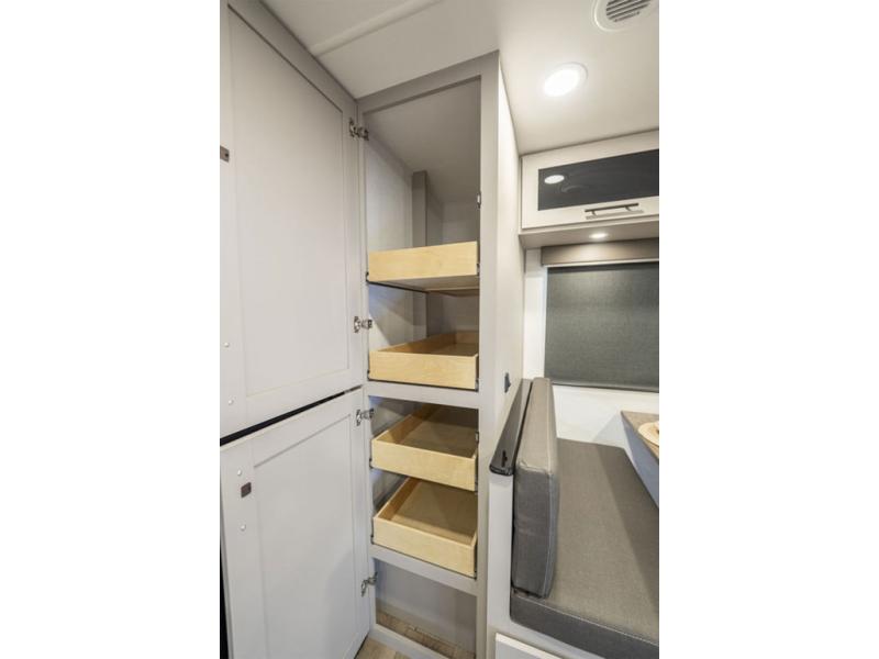 Grab your hiking boots and your sense of adventure for fun camping trips in this single slide out travel trailer. The rear booth dinette includes overhead storage for your things and the sofa slide out is in great view of the 40" HDTV. There is also a fireplace here that will make your space feel more like home plus more storage space, including a pantry with pull out trays and storage above the 10 cu. ft. 12V refrigerator. A walk-through bath will take you to the front master bedroom with a queen bed, wardrobe nightstands, plus its own exterior entry door!
