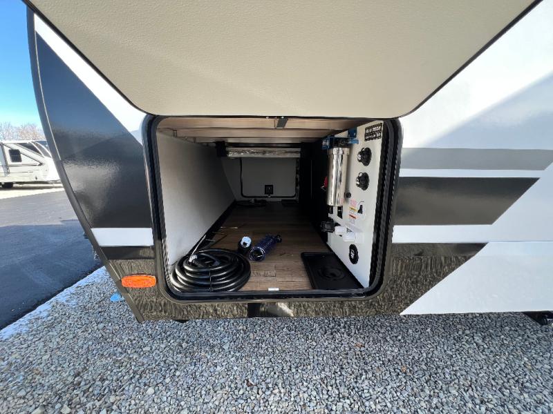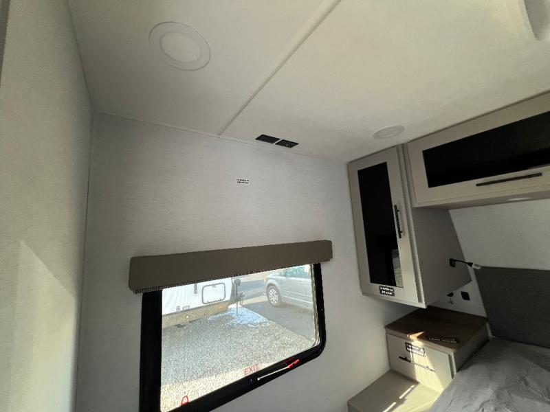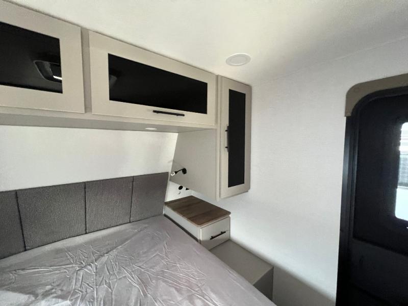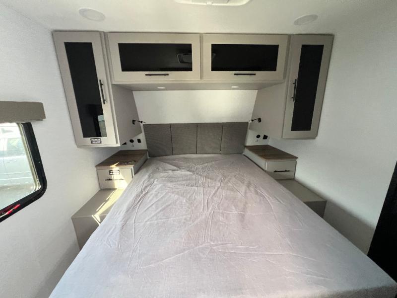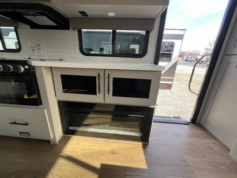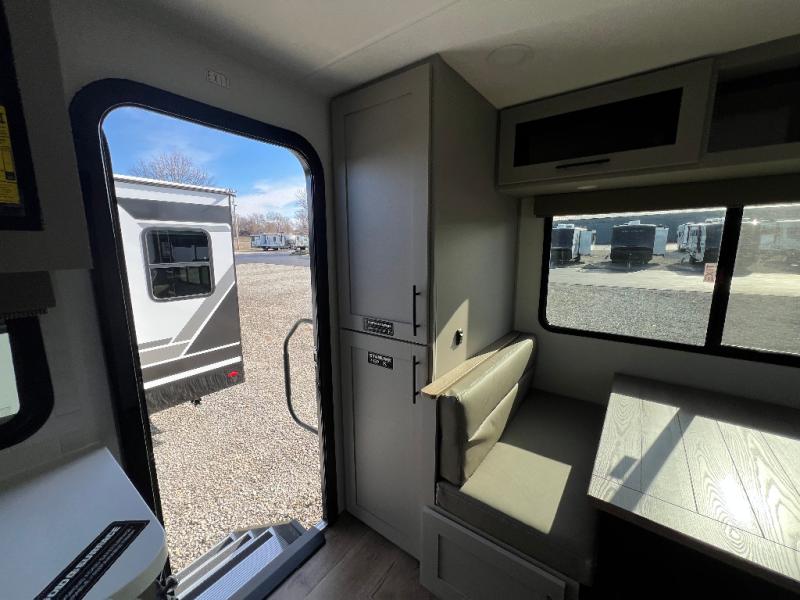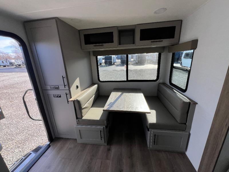 Grab your hiking boots and your sense of adventure for fun camping trips in this single slide out travel trailer. The rear booth dinette includes overhead storage for your things and the sofa slide out is in great view of the 40" HDTV. There is also a fireplace here that will make your space feel more like home plus more storage space, including a pantry with pull out trays and storage above the 10 cu. ft. 12V refrigerator. A walk-through bath will take you to the front master bedroom with a queen bed, wardrobe nightstands, plus its own exterior entry door!