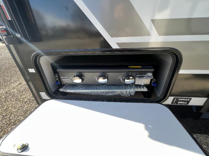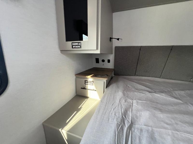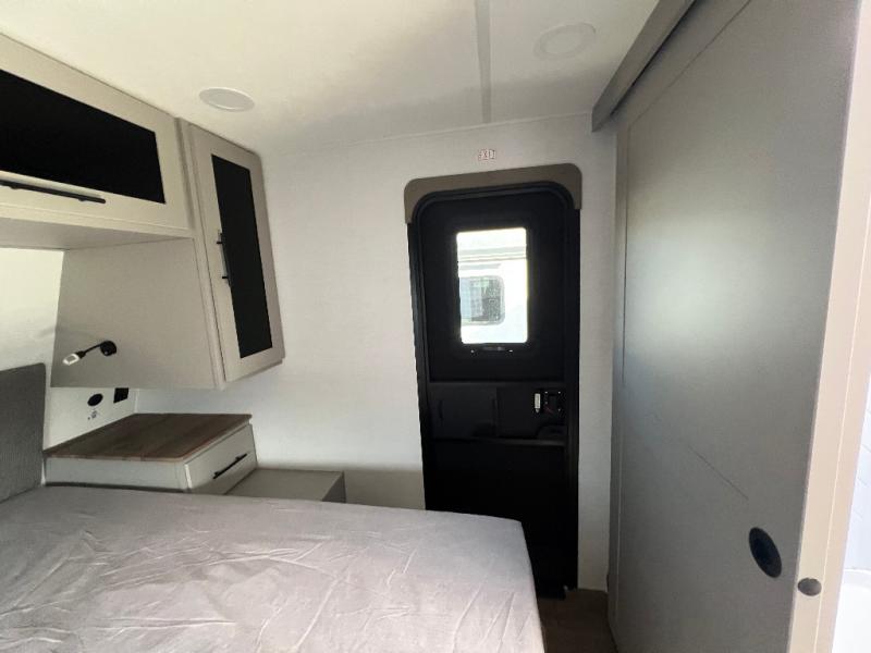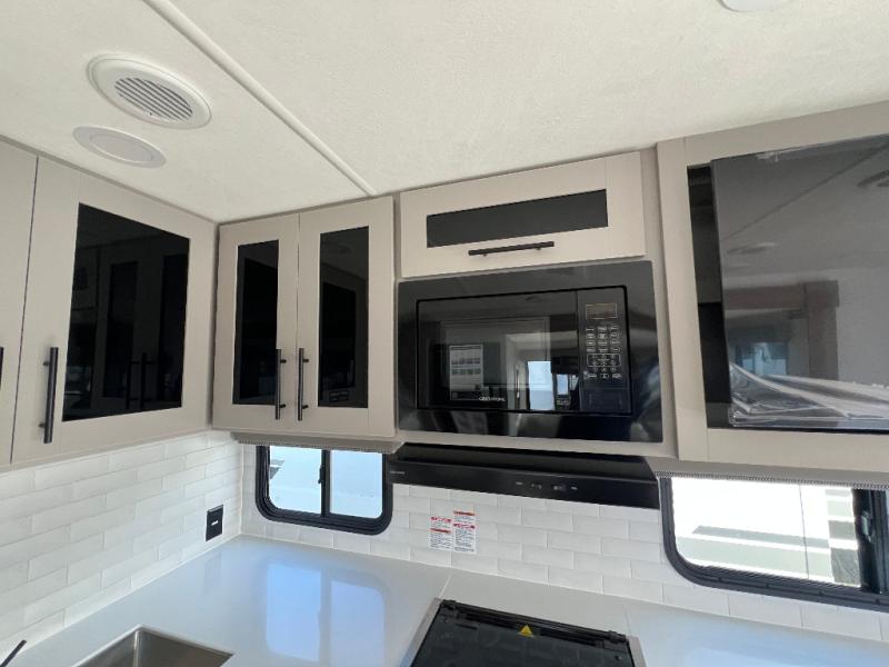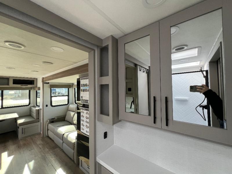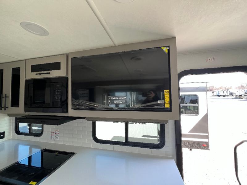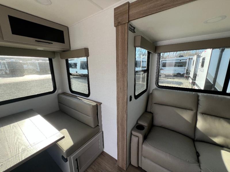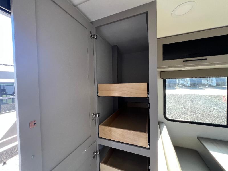 Grab your hiking boots and your sense of adventure for fun camping trips in this single slide out travel trailer. The rear booth dinette includes overhead storage for your things and the sofa slide out is in great view of the 40" HDTV. There is also a fireplace here that will make your space feel more like home plus more storage space, including a pantry with pull out trays and storage above the 10 cu. ft. 12V refrigerator. A walk-through bath will take you to the front master bedroom with a queen bed, wardrobe nightstands, plus its own exterior entry door!