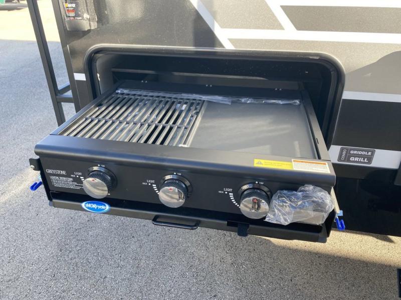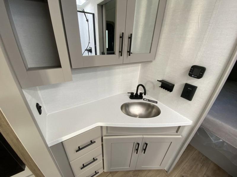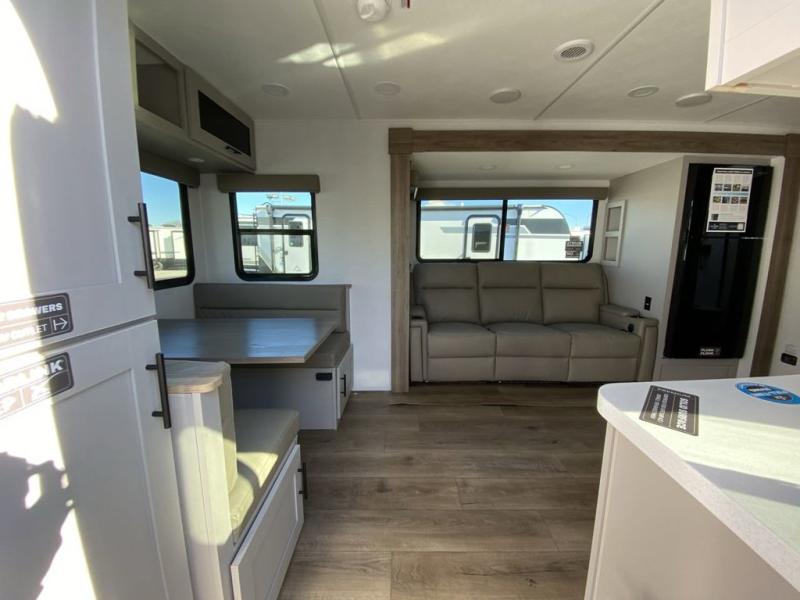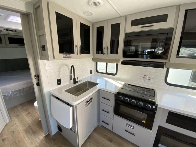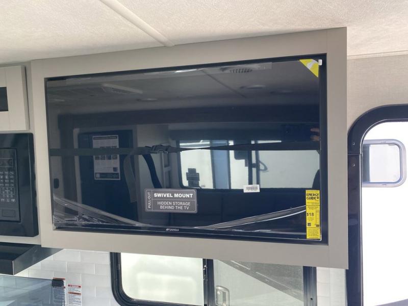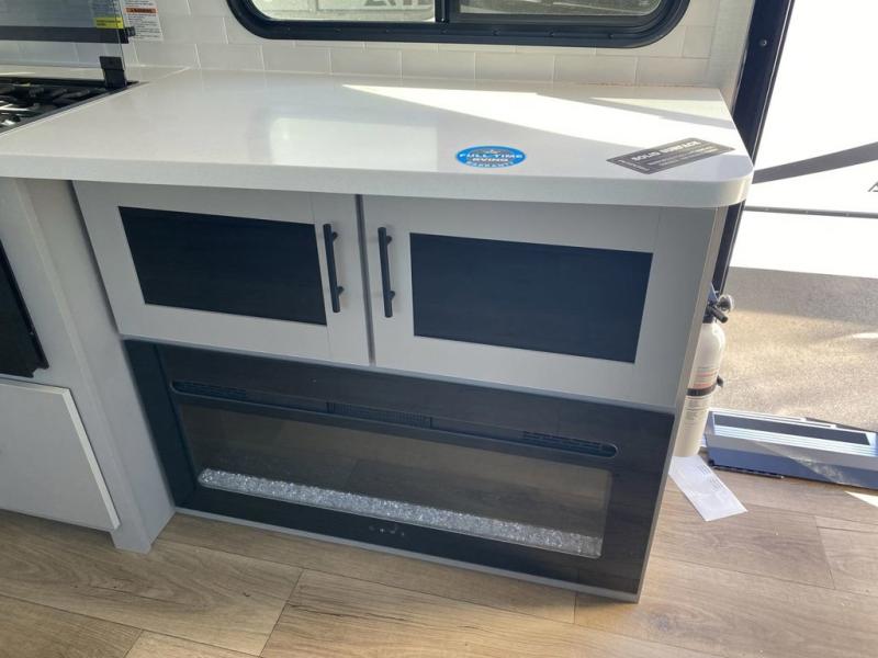 Grab your hiking boots and your sense of adventure for fun camping trips in this single slide out travel trailer. The rear booth dinette includes overhead storage for your things and the sofa slide out is in great view of the 40" HDTV. There is also a fireplace here that will make your space feel more like home plus more storage space, including a pantry with pull out trays and storage above the 10 cu. ft. 12V refrigerator. A walk-through bath will take you to the front master bedroom with a queen bed, wardrobe nightstands, plus its own exterior entry door!