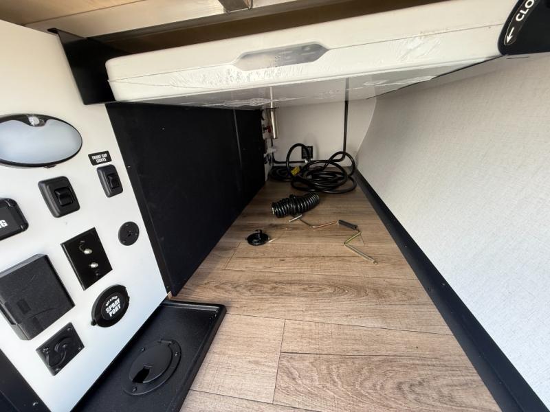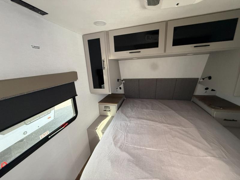 Grab your hiking boots and your sense of adventure for fun camping trips in this single slide out travel trailer. The rear booth dinette includes overhead storage for your things and the sofa slide out is in great view of the 40" HDTV. There is also a fireplace here that will make your space feel more like home plus more storage space, including a pantry with pull out trays and storage above the 10 cu. ft. 12V refrigerator. A walk-through bath will take you to the front master bedroom with a queen bed, wardrobe nightstands, plus its own exterior entry door!
