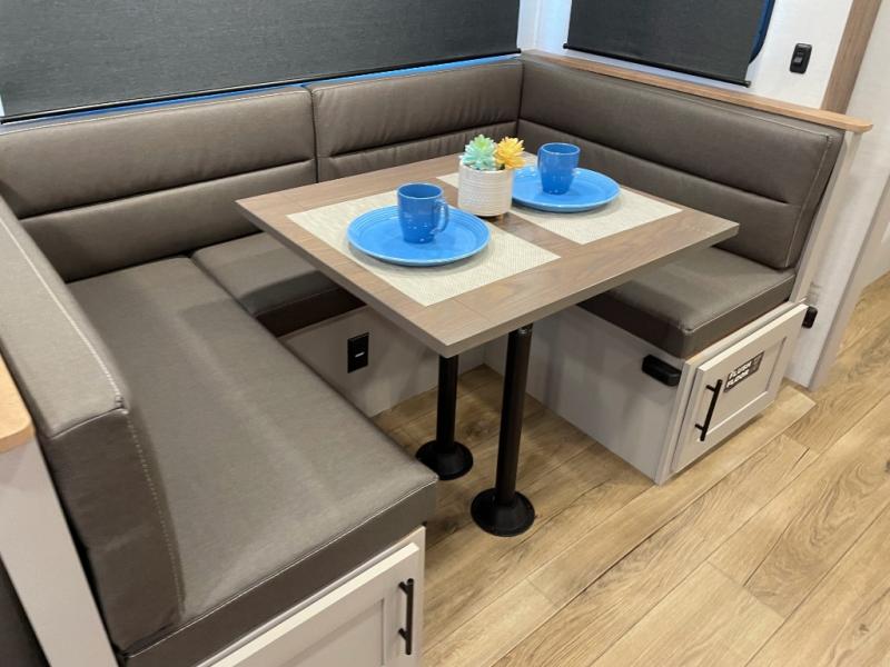 You will love all of your adventures with this Delta travel trailer in tow! This unit is perfect for a couple or even a family of four or six with a queen bed in the front private bedroom, and also using the sofa and U-shaped dinette once converted for more sleeping space. The U-shaped dinette is great for gathering for meals, a board game or game of cards, and the sofa is directly opposite a 40" HDTV which makes viewing enjoyable. You can easily prepare all of your favorite meals and snacks with the kitchen amenities provided inside. A three burner range allows you to easily cook indoors, or you can cook outside using the outdoor griddle/grill if you like. There is a 10 cu. ft. 12V refrigerator to keep all of your perishables and drinks nice and cold, plus a large sink for dishes and cleaning up, and a convenient pull-out trash can and flip-up counter extension as well. You will also appreciate the full rear bath featuring a 30" x 36" shower, toilet, vanity with sink, and linen cabinet for your towels and toiletries.