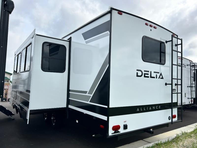 Form and function works together with every one of these Alliance RV Delta travel trailers! They are built with a walk-on roof with a seamless PVC roof covering, Mylar reinforced exterior seals, and a heated and enclosed underbelly to protect your unit in all seasons. The commercial grade vinyl flooring will be easy to clean and the oversized atrium windows throughout let in plenty of natural sunlight. With 62 cu. ft. of drop frame pass-through storage, you can bring along all of your essential camping gear plus it has USB charging for more convenience. There are many at home interior conveniences including a Bluetooth speaker, USB charging throughout, and even a pull-out kitchen trash can. Come find your favorite model today!