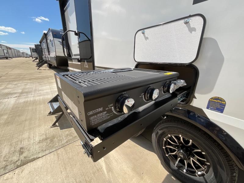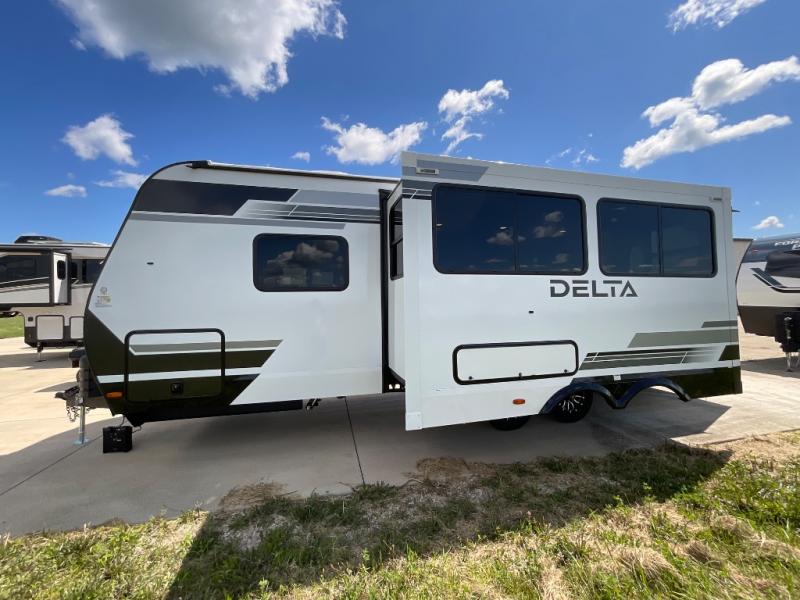 You will love all of your adventures with this Delta travel trailer in tow! This unit is perfect for a couple or even a family of four with a queen bed in the front private bedroom and also using the U-shaped dinette once converted for more sleeping space. The U-shaped dinette is great for gathering for meals, a board game or game of cards, and the sofa is directly opposite a 40" HDTV which makes viewing enjoyable. You can easily prepare all of your favorite meals and snacks with the kitchen amenities provided inside. A three burner range allows you to easily cook indoors, or you can cook outside using the outdoor griddle/grill if you like. There is a 10 cu. ft. 12V refrigerator to keep all of your perishables and drinks nice and cold, plus a large sink for dishes and cleaning up, and a convenient pull-out trash can and flip-up counter extension as well. You will also appreciate the full rear bath featuring a 30" x 36" shower, toilet, vanity with sink, and linen cabinet for your towels and toiletries.