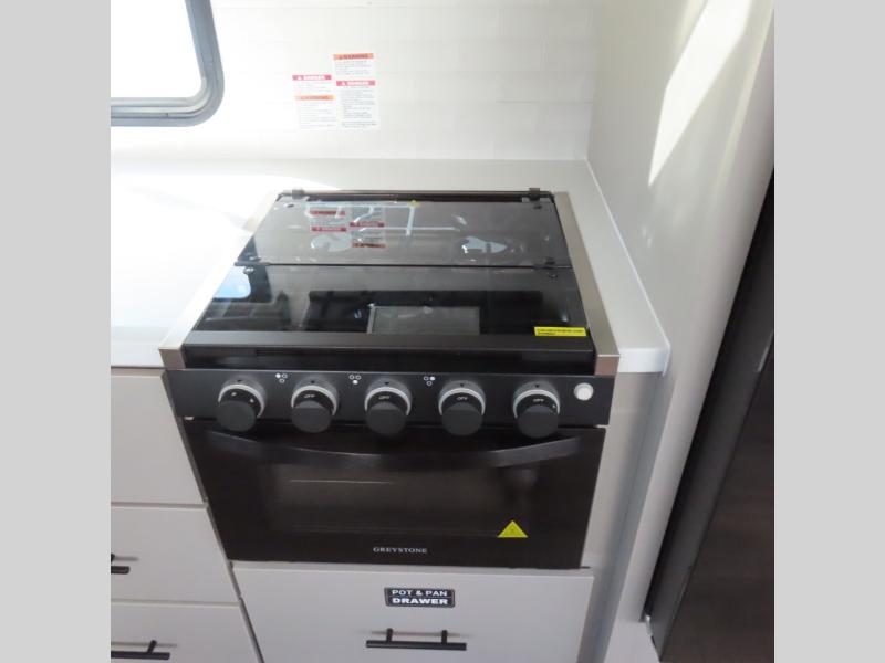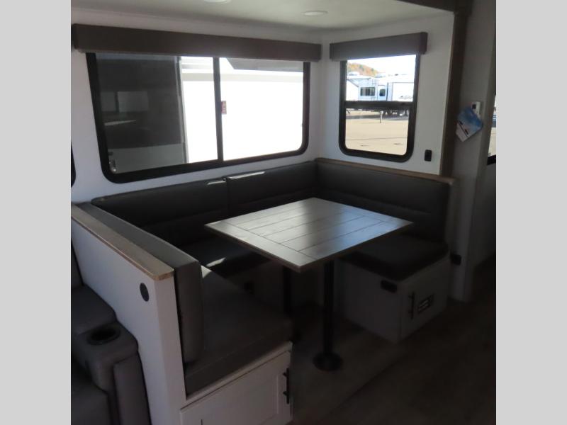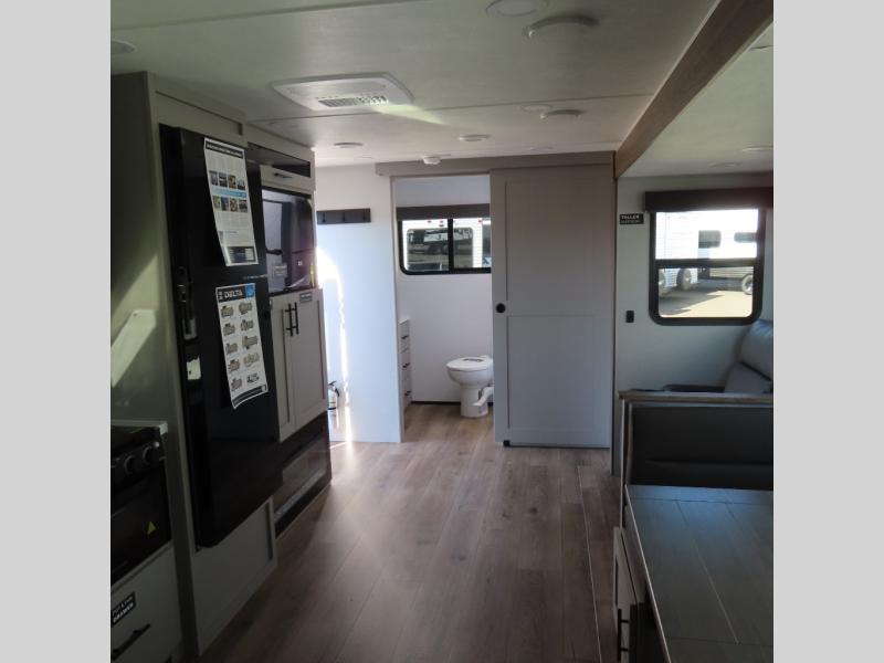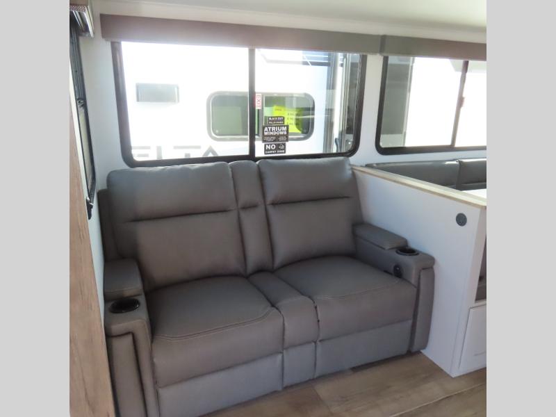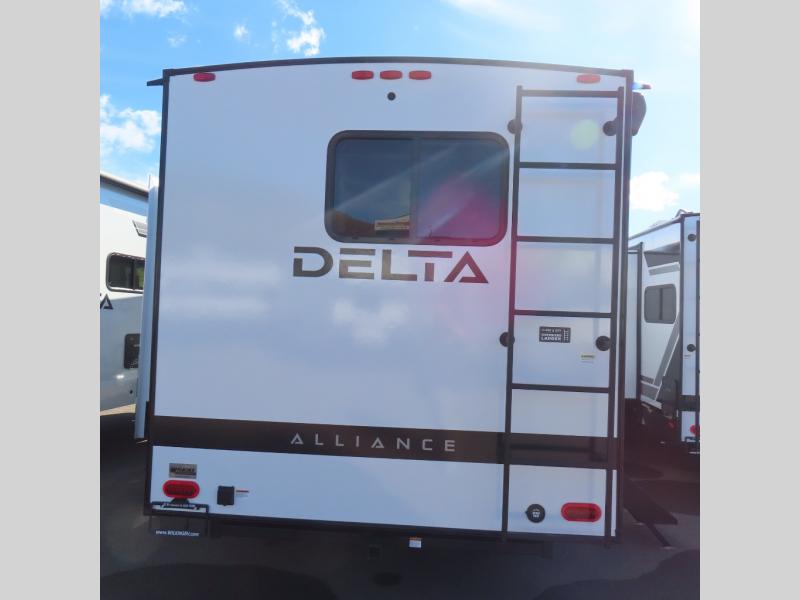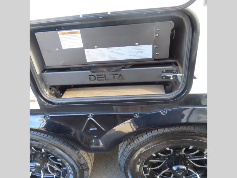 You will love all of your adventures with this Delta travel trailer in tow! This unit is perfect for a couple or even a family of four with a queen bed in the front private bedroom and also using the U-shaped dinette once converted for more sleeping space. The U-shaped dinette is great for gathering for meals, a board game or game of cards, and the sofa is directly opposite a 40" HDTV which makes viewing enjoyable. You can easily prepare all of your favorite meals and snacks with the kitchen amenities provided inside. A three burner range allows you to easily cook indoors, or you can cook outside using the outdoor griddle/grill if you like. There is a 10 cu. ft. 12V refrigerator to keep all of your perishables and drinks nice and cold, plus a large sink for dishes and cleaning up, and a convenient pull-out trash can and flip-up counter extension as well. You will also appreciate the full rear bath featuring a 30" x 36" shower, toilet, vanity with sink, and linen cabinet for your towels and toiletries.