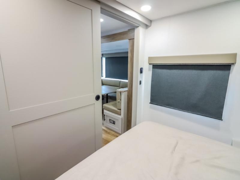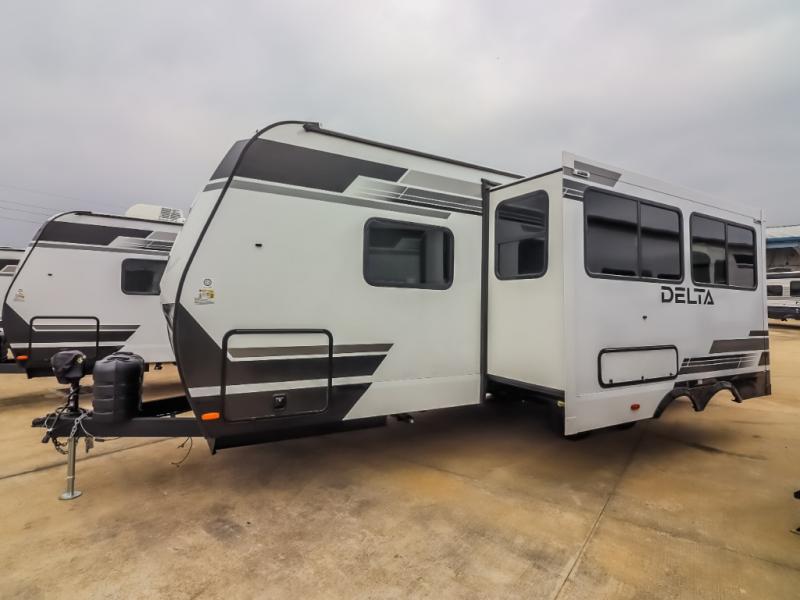 You will love all of your adventures with this Delta travel trailer in tow! This unit is perfect for a couple or even a family of four with a queen bed in the front private bedroom and also using the U-shaped dinette once converted for more sleeping space. The U-shaped dinette is great for gathering for meals, a board game or game of cards, and the sofa is directly opposite a 40" HDTV which makes viewing enjoyable. You can easily prepare all of your favorite meals and snacks with the kitchen amenities provided inside. A three burner range allows you to easily cook indoors, or you can cook outside using the outdoor griddle/grill if you like. There is a 10 cu. ft. 12V refrigerator to keep all of your perishables and drinks nice and cold, plus a large sink for dishes and cleaning up, and a convenient pull-out trash can and flip-up counter extension as well. You will also appreciate the full rear bath featuring a 30" x 36" shower, toilet, vanity with sink, and linen cabinet for your towels and toiletries.