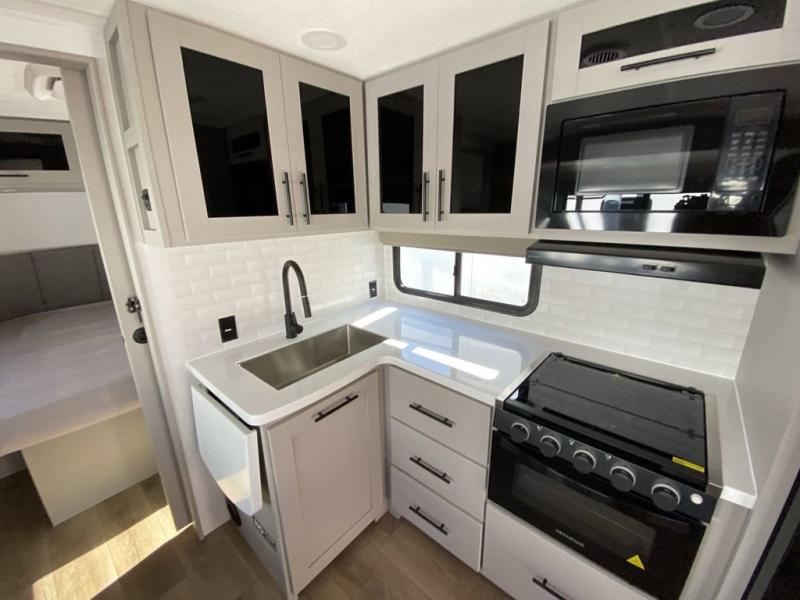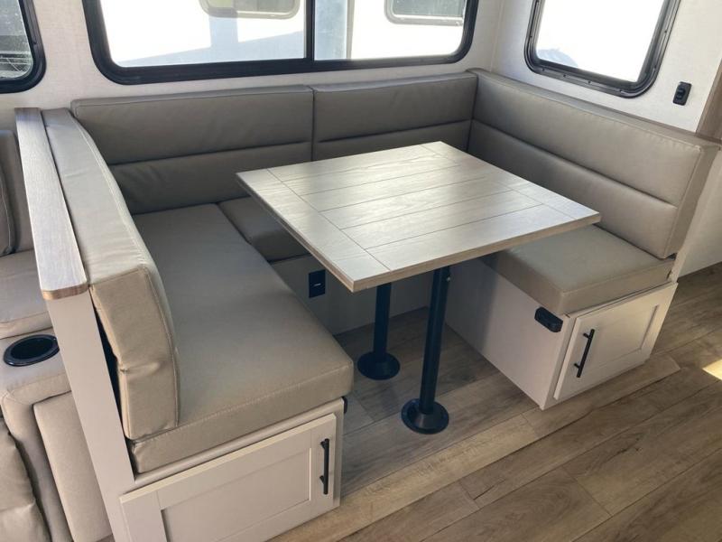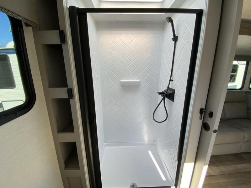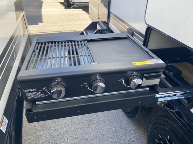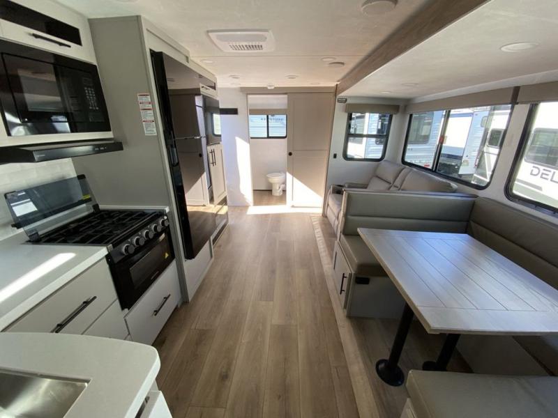 You will love all of your adventures with this Delta travel trailer in tow! This unit is perfect for a couple or even a family of four with a queen bed in the front private bedroom and also using the U-shaped dinette once converted for more sleeping space. The U-shaped dinette is great for gathering for meals, a board game or game of cards, and the sofa is directly opposite a 40" HDTV which makes viewing enjoyable. You can easily prepare all of your favorite meals and snacks with the kitchen amenities provided inside. A three burner range allows you to easily cook indoors, or you can cook outside using the outdoor griddle/grill if you like. There is a 10 cu. ft. 12V refrigerator to keep all of your perishables and drinks nice and cold, plus a large sink for dishes and cleaning up, and a convenient pull-out trash can and flip-up counter extension as well. You will also appreciate the full rear bath featuring a 30" x 36" shower, toilet, vanity with sink, and linen cabinet for your towels and toiletries.