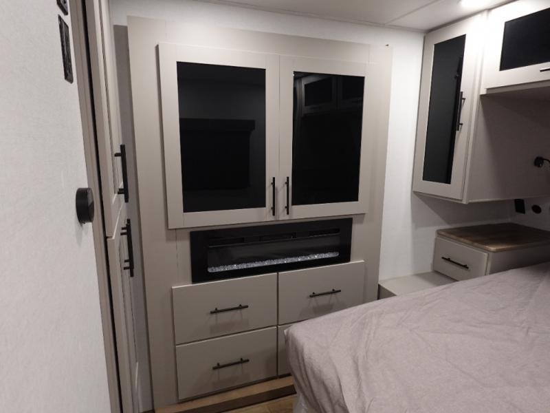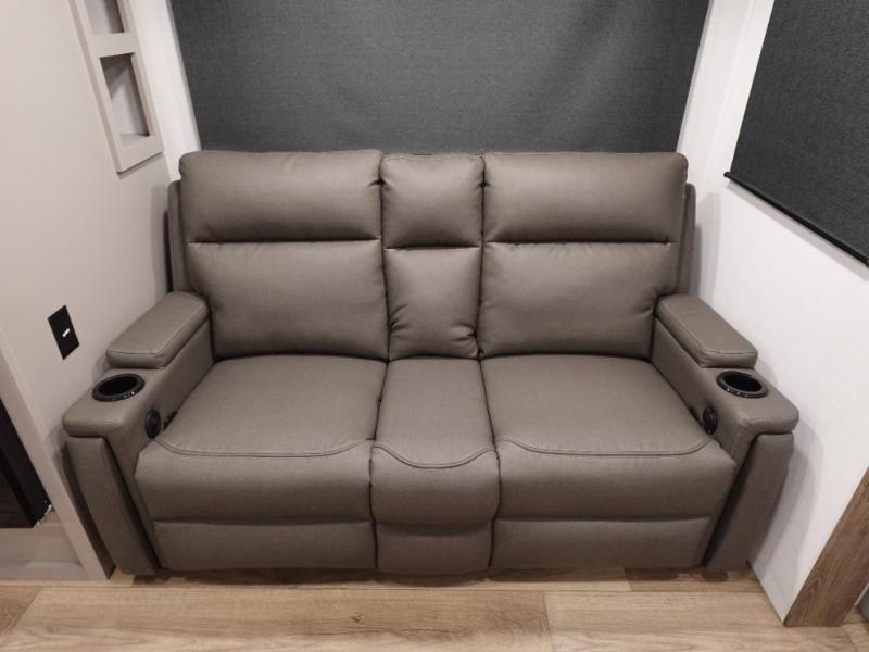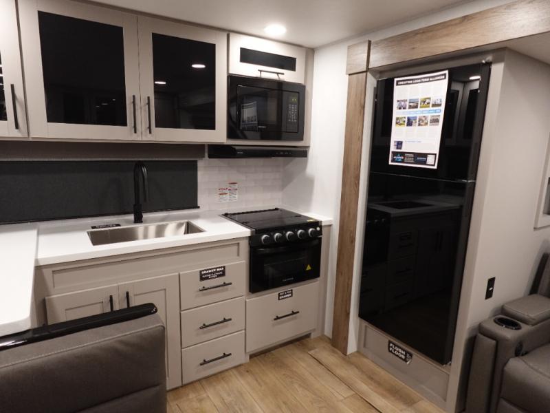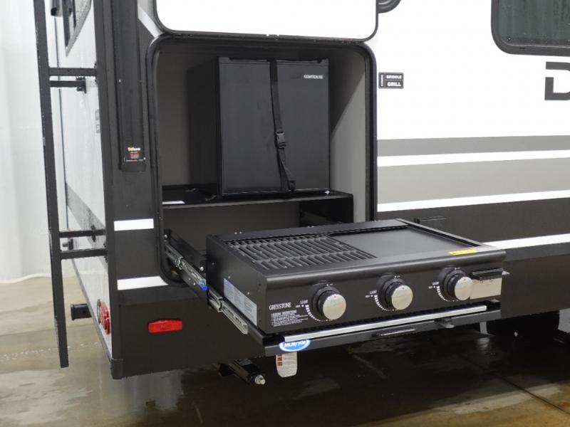 Head to your favorite camping spot in this double slide out travel trailer! You can set up the 19' awning when you arrive, then start lunch on the exterior griddle. There is also an exterior refrigerator for cold drinks! If the weather isn't cooperating, the rear kitchen includes generous counter space to prep meals and all the appliances needed. A booth dinette inside provides a place to dine together. You're sure to enjoy the theater seat in direct view of the 40" TV for movie nights, and when you're ready to call it a night, the queen bed in the front bedroom will provide a great night's rest.