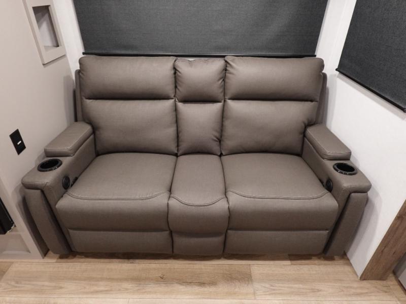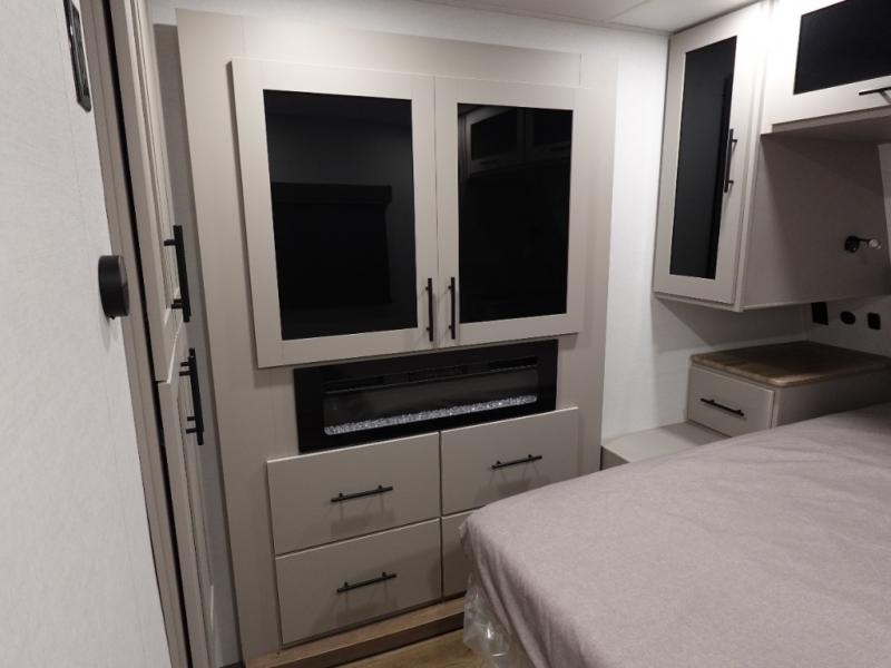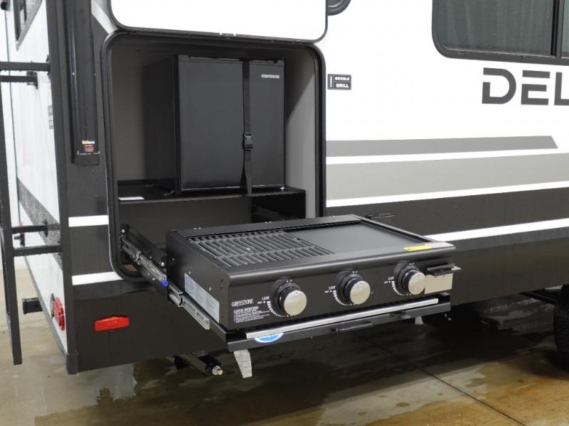 Head to your favorite camping spot in this double slide out travel trailer! You can set up the 19' awning when you arrive, then start lunch on the exterior griddle. There is also an exterior refrigerator for cold drinks! If the weather isn't cooperating, the rear kitchen includes generous counter space to prep meals and all the appliances needed. You're sure to enjoy the theater seat in direct view of the 40" TV for movie nights, and when you're ready to call it a night, the queen bed in the front bedroom will provide a great night's rest.