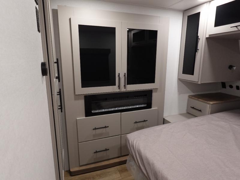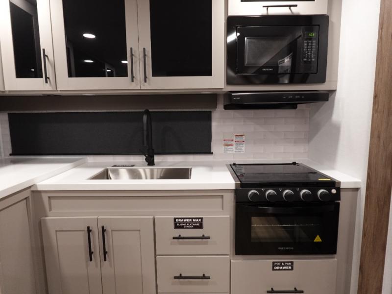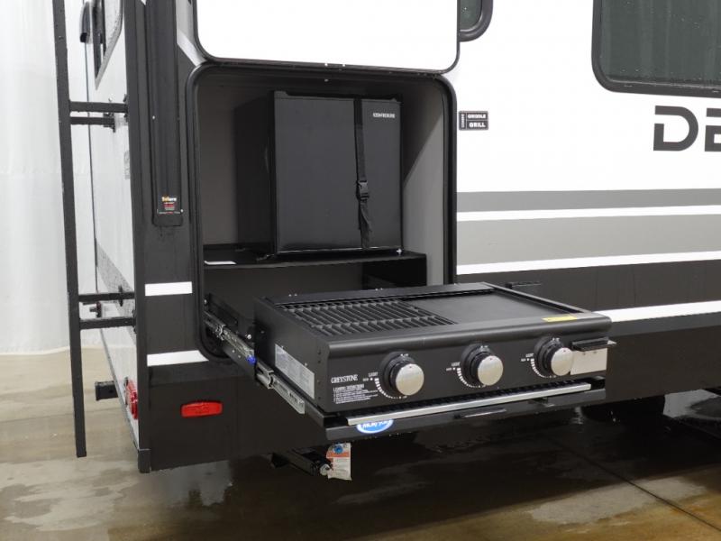 Head to your favorite camping spot in this double slide out travel trailer! You can set up the 19' awning when you arrive, then start lunch on the exterior griddle. There is also an exterior refrigerator for cold drinks! If the weather isn't cooperating, the rear kitchen includes generous counter space to prep meals and all the appliances needed. You're sure to enjoy the theater seat in direct view of the 40" TV for movie nights, and when you're ready to call it a night, the bed in the front bedroom will provide a great night's rest.