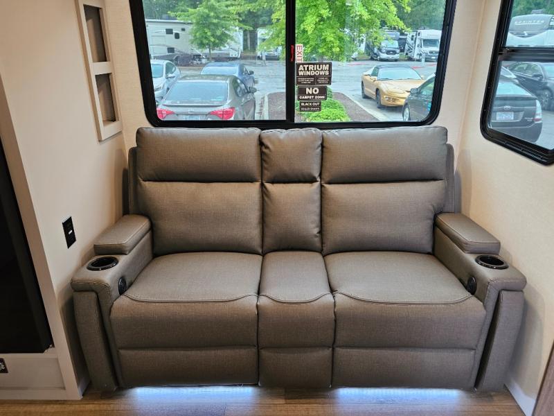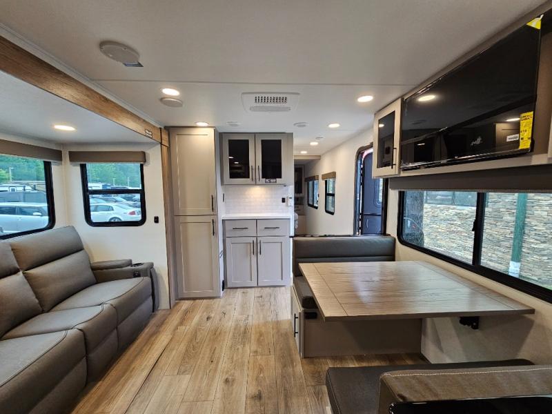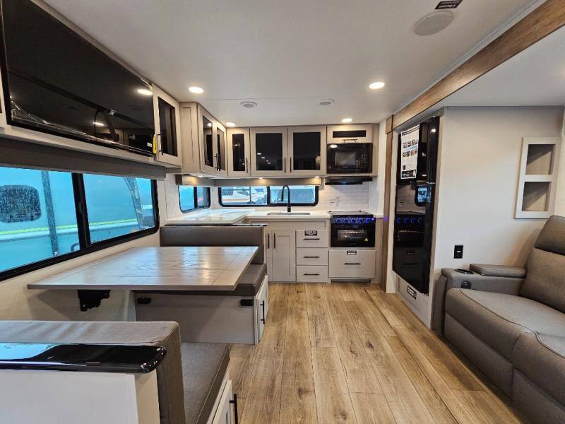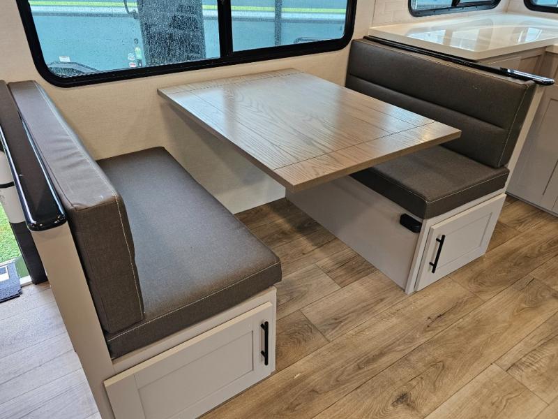 Living Area: The slide-out hosts comfortable theater seating and a booth dinette, providing ample space for relaxation and dining.