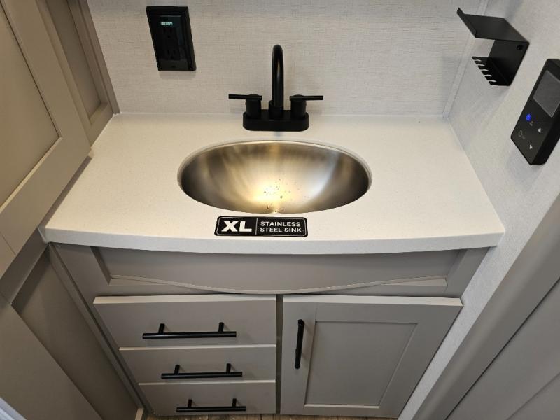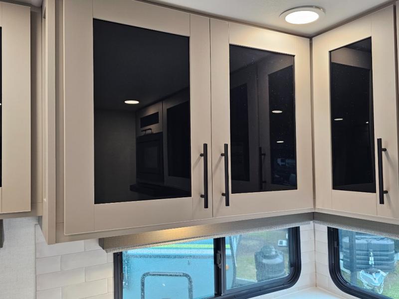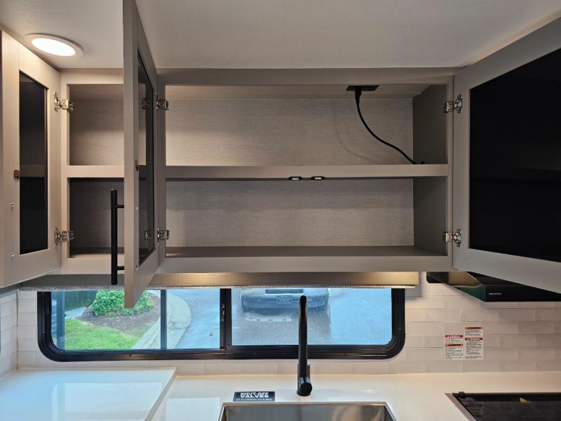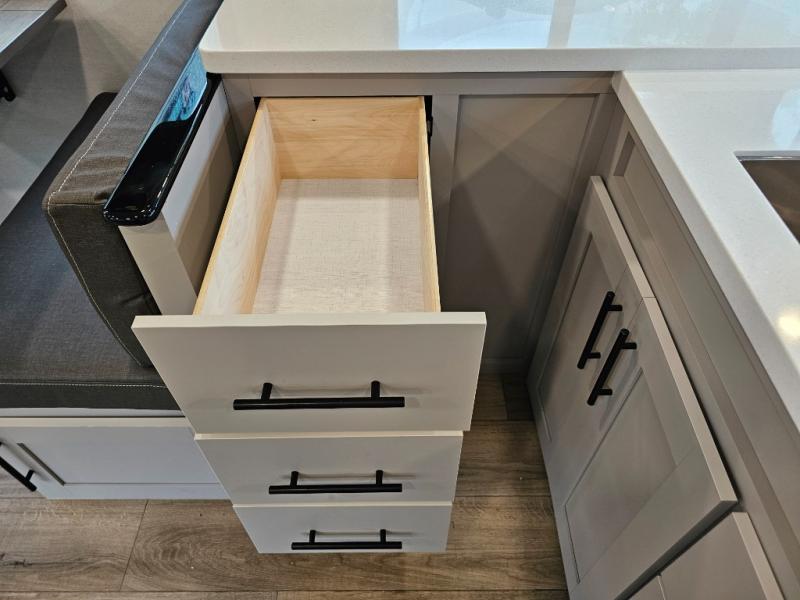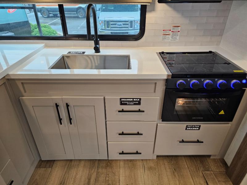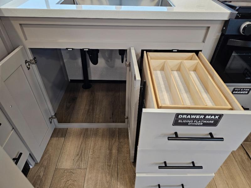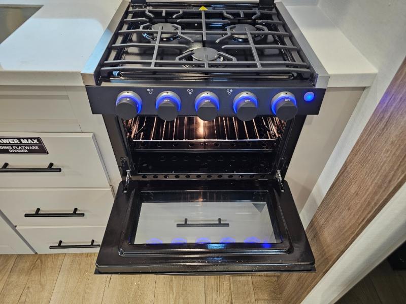 Rear Kitchen: Equipped with a three-burner cooktop, 10 cu. ft. 12V refrigerator, large sink, and ample counter space, the rear L-shaped kitchen is perfect for meal preparation.