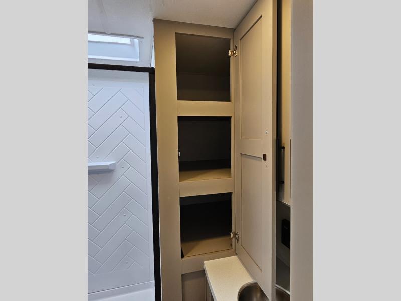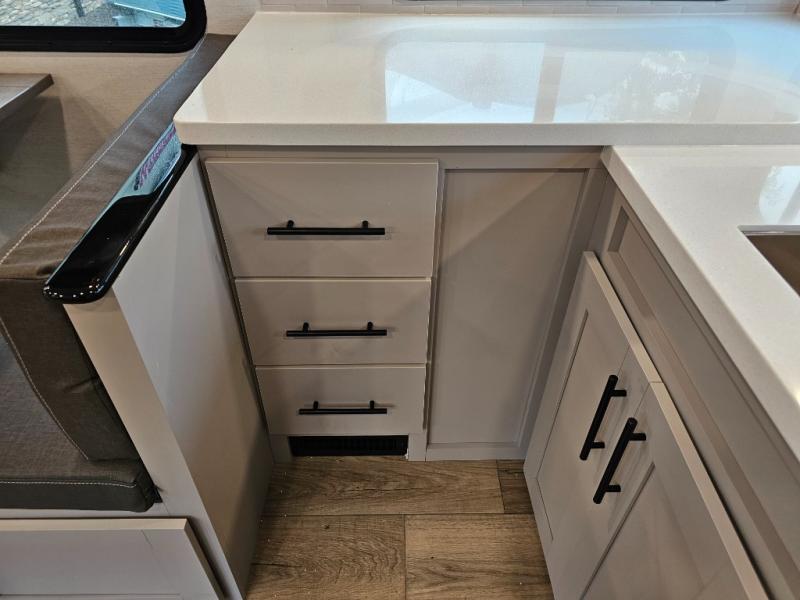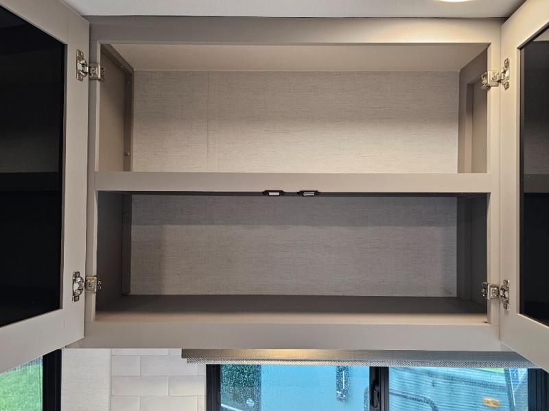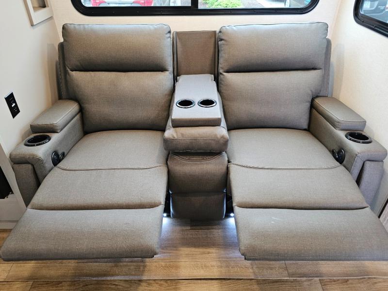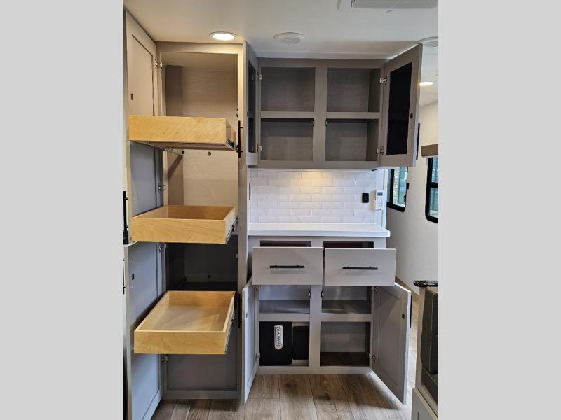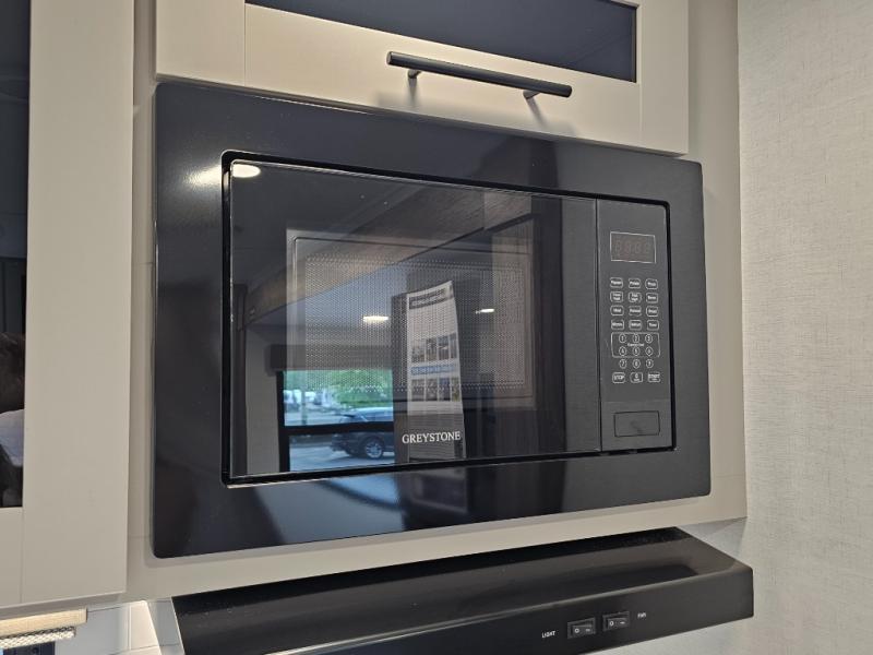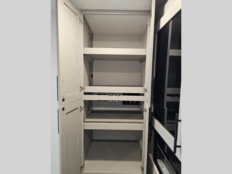 Rear Kitchen: Equipped with a three-burner cooktop, 10 cu. ft. 12V refrigerator, large sink, and ample counter space, the rear L-shaped kitchen is perfect for meal preparation.