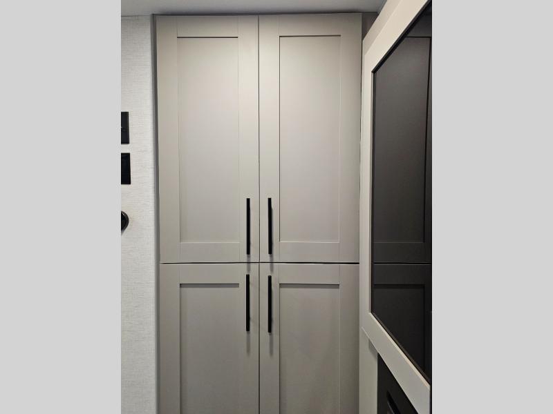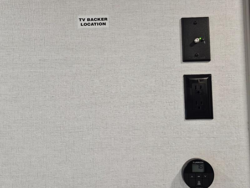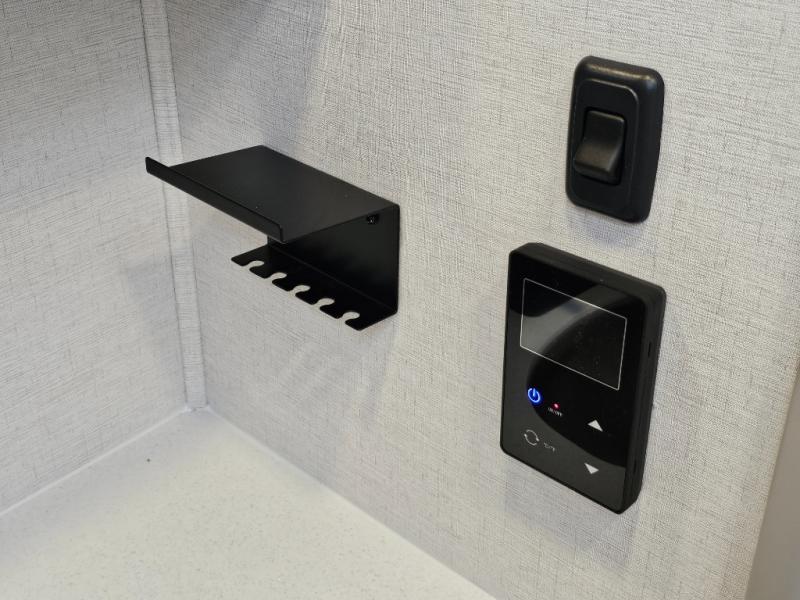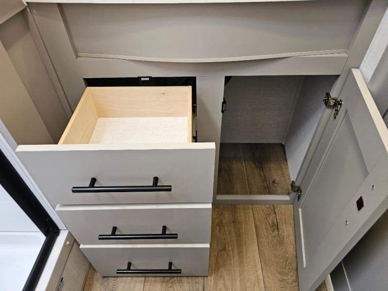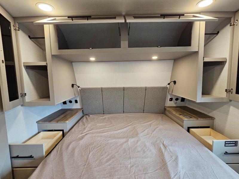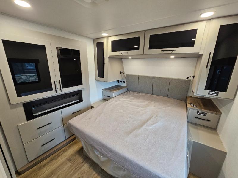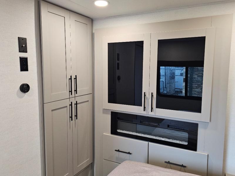 Bedroom: The private front bedroom features a 60" x 80" queen bed, a wardrobe slide-out, and a cozy fireplace, creating a restful retreat.