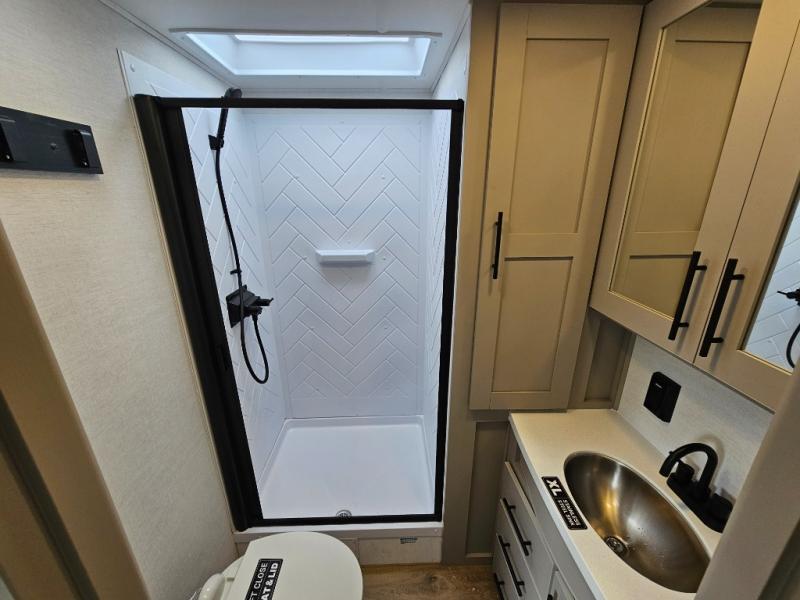 Bathroom: The mid-bath includes a spacious 30" x 36" shower, porcelain toilet, and stylish vanity.
