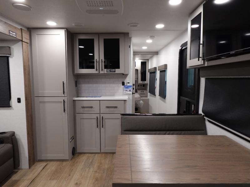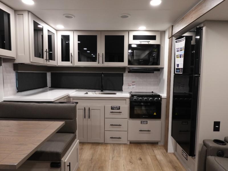 Head to your favorite camping spot in this double slide out travel trailer! You can set up the 19' awning when you arrive, then start lunch on the exterior griddle. There is also an exterior refrigerator for cold drinks! If the weather isn't cooperating, the rear kitchen includes generous counter space to prep meals and all the appliances needed. A booth dinette inside provides a place to dine together. You're sure to enjoy the theater seat in direct view of the 40" TV for movie nights, and when you're ready to call it a night, the queen bed in the front bedroom will provide a great night's rest.