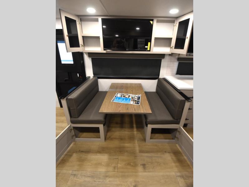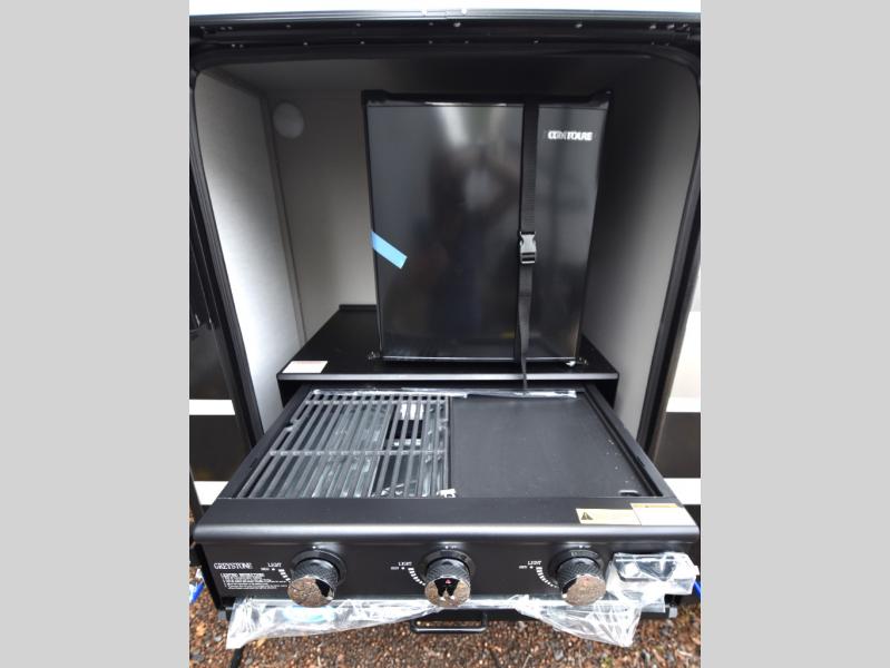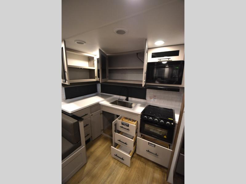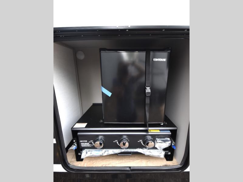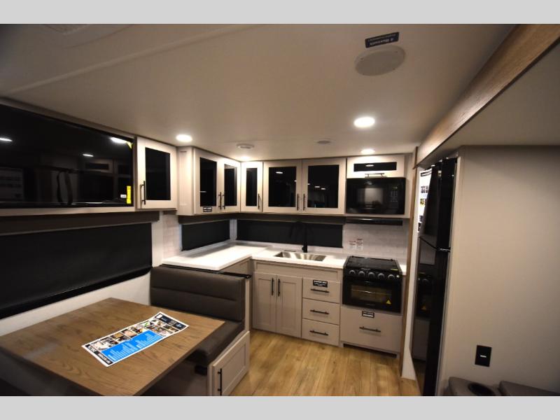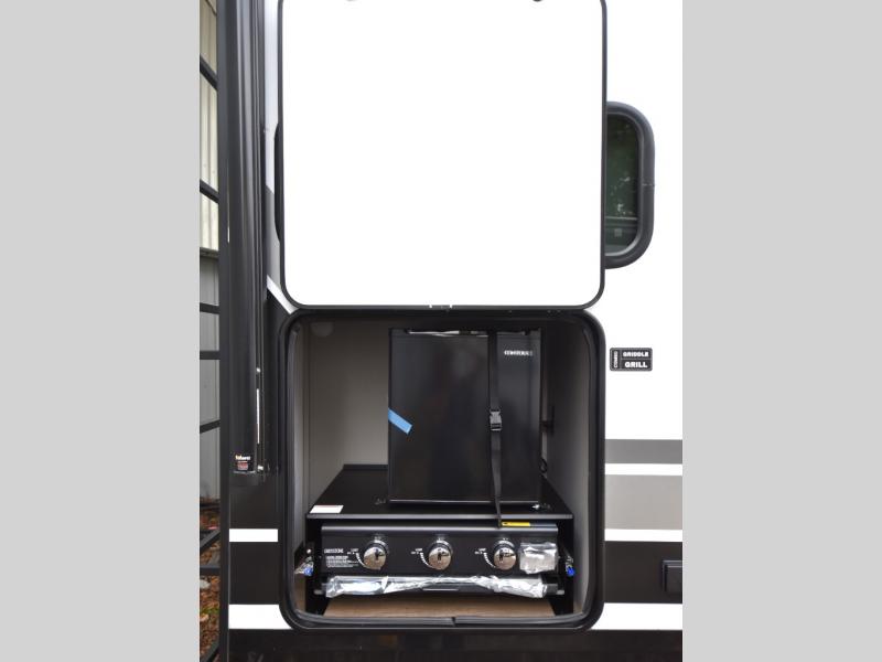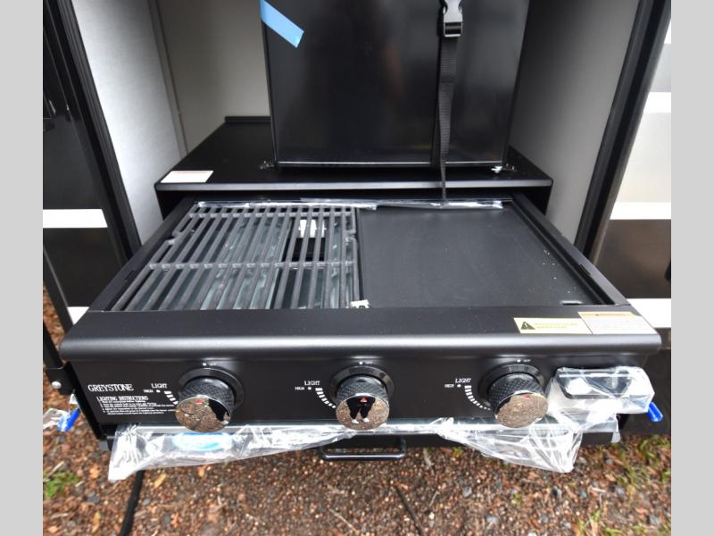Head to your favorite camping spot in this double slide out travel trailer! You can set up the 19' awning when you arrive, then start lunch on the exterior griddle. There is also an exterior refrigerator for cold drinks! If the weather isn't cooperating, the rear kitchen includes generous counter space to prep meals and all the appliances needed. A booth dinette inside provides a place to dine together, or you can choose the optional table and chairs if you prefer that seating arrangement. You're sure to enjoy the theater seat in direct view of the 40" TV for movie nights, and when you're ready to call it a night, the queen bed in the front bedroom will provide a great night's rest.