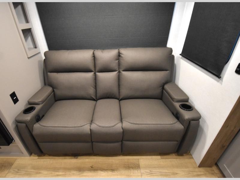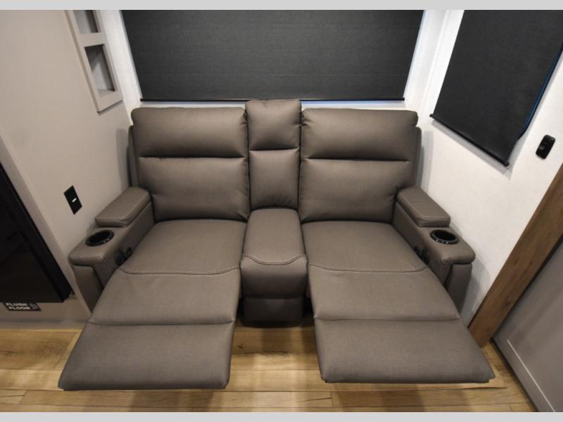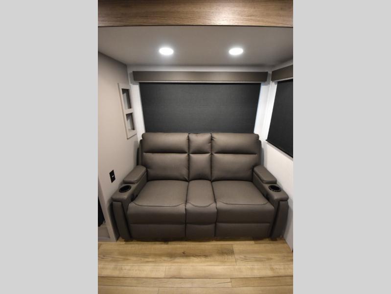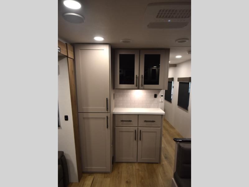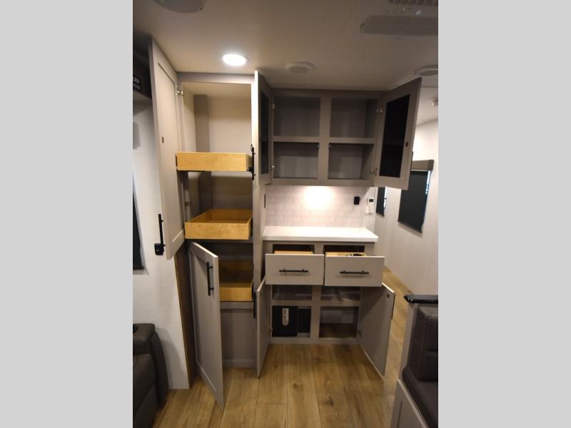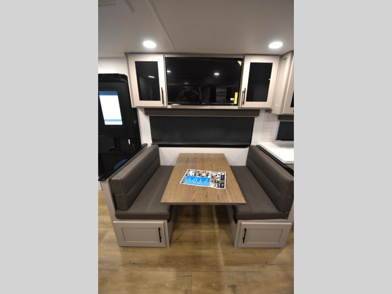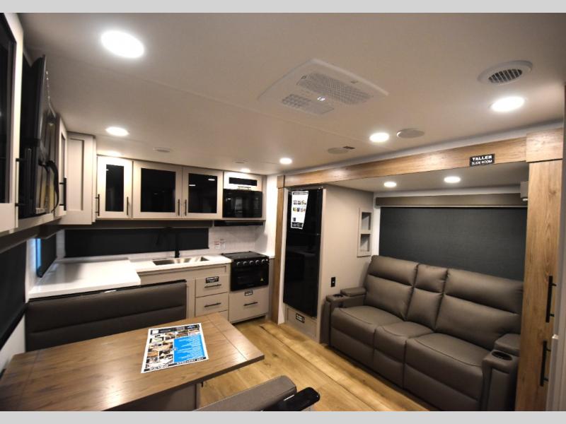 Head to your favorite camping spot in this double slide out travel trailer! You can set up the 19' awning when you arrive, then start lunch on the exterior griddle. There is also an exterior refrigerator for cold drinks! If the weather isn't cooperating, the rear kitchen includes generous counter space to prep meals and all the appliances needed. A booth dinette inside provides a place to dine together, or you can choose the optional table and chairs if you prefer that seating arrangement. You're sure to enjoy the theater seat in direct view of the 40" TV for movie nights, and when you're ready to call it a night, the queen bed in the front bedroom will provide a great night's rest.