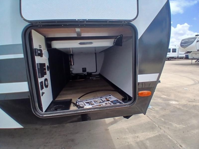 Head to your favorite camping spot in this double slide out travel trailer! You can set up the 19' awning when you arrive, then start lunch on the exterior griddle. There is also an exterior refrigerator for cold drinks! If the weather isn't cooperating, the rear kitchen includes generous counter space to prep meals and all the appliances needed. A booth dinette inside provides a place to dine together, or you can choose the optional table and chairs if you prefer that seating arrangement. You're sure to enjoy the theater seat in direct view of the 40" TV for movie nights, and when you're ready to call it a night, the queen bed in the front bedroom will provide a great night's rest.
