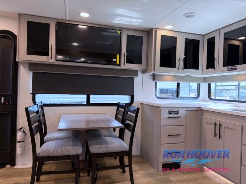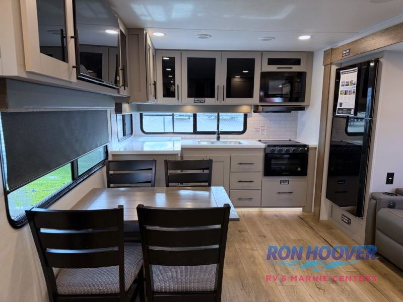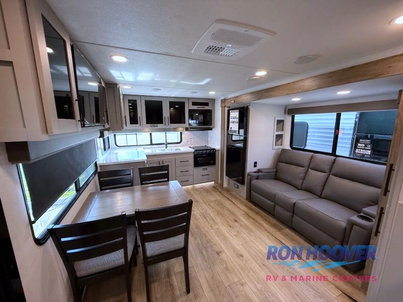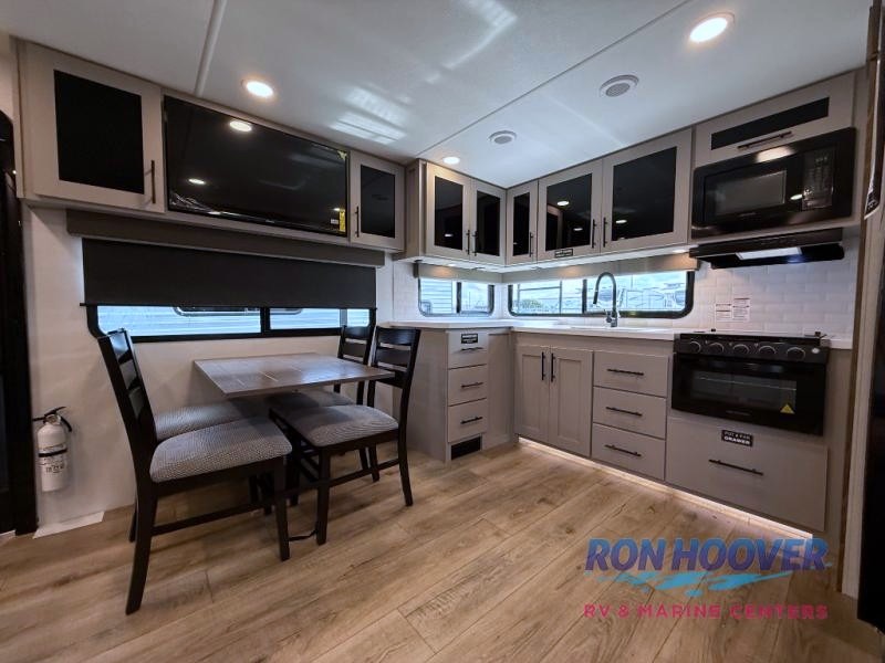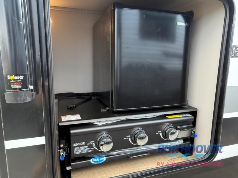 Head to your favorite camping spot in this double slide out travel trailer! You can set up the 19' awning when you arrive, then start lunch on the exterior griddle. There is also an exterior refrigerator for cold drinks! If the weather isn't cooperating, the rear kitchen includes generous counter space to prep meals and all the appliances needed. A booth dinette inside provides a place to dine together, or you can choose the optional table and chairs if you prefer that seating arrangement. You're sure to enjoy the theater seat in direct view of the 40" TV for movie nights, and when you're ready to call it a night, the queen bed in the front bedroom will provide a great night's rest.