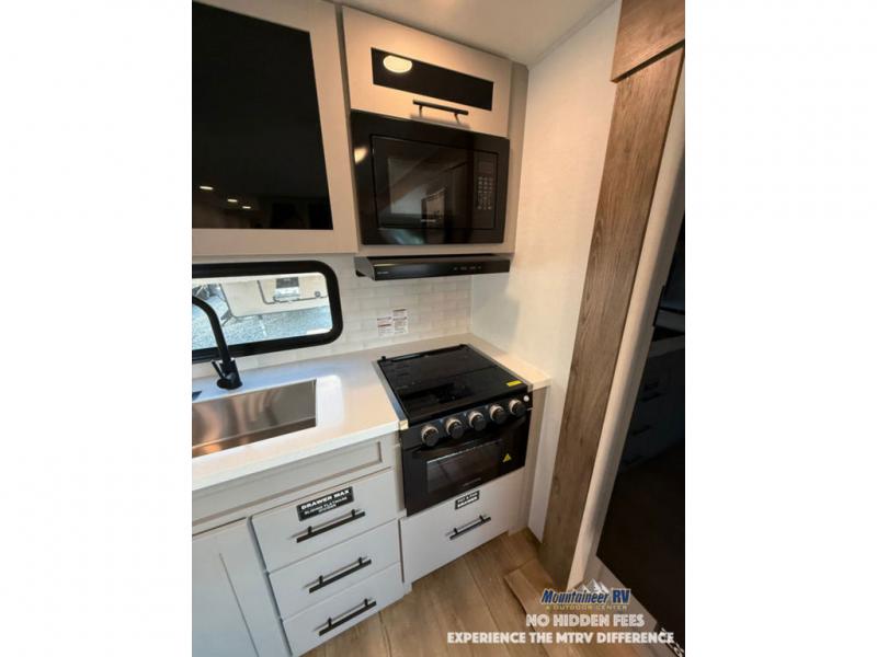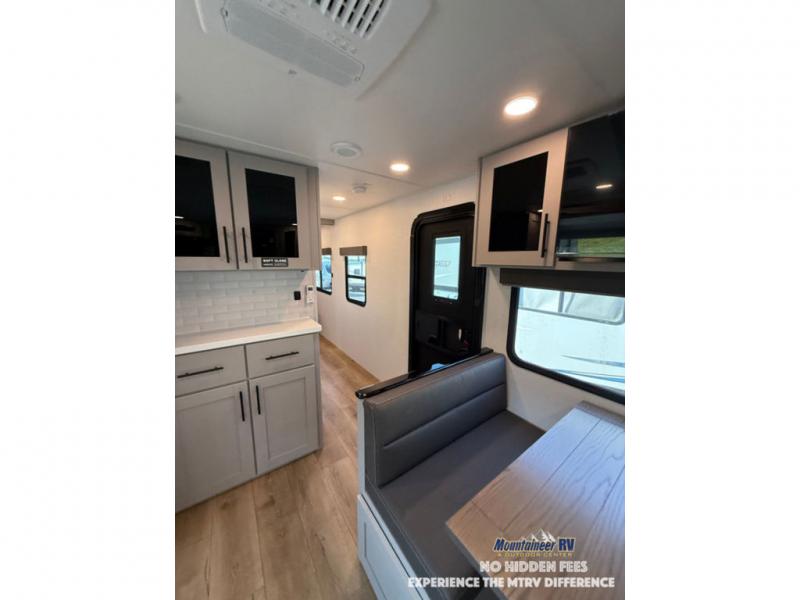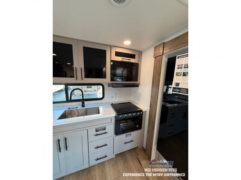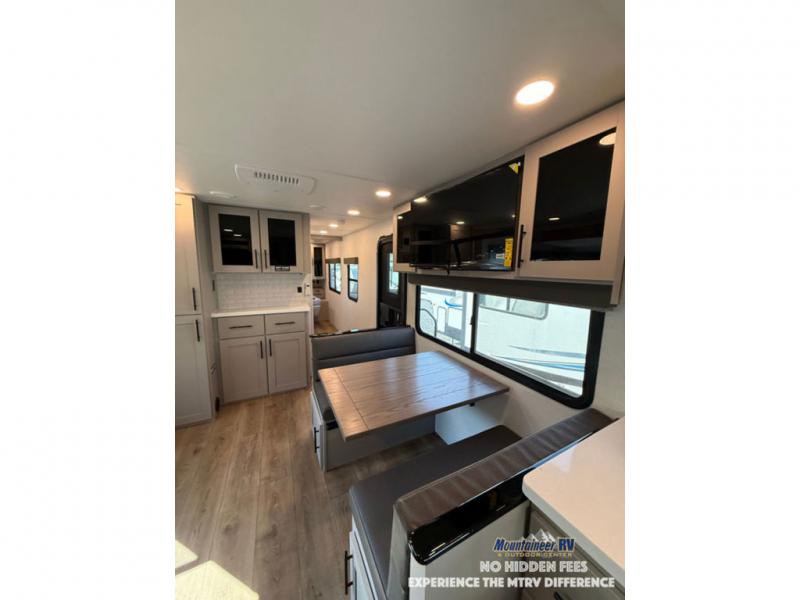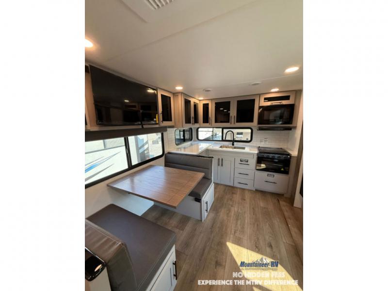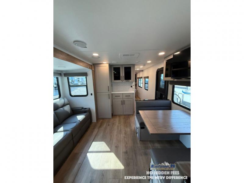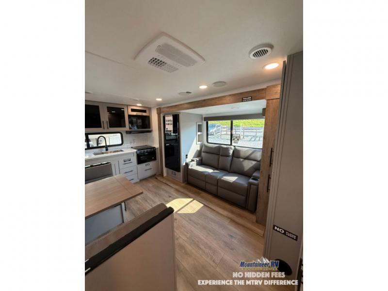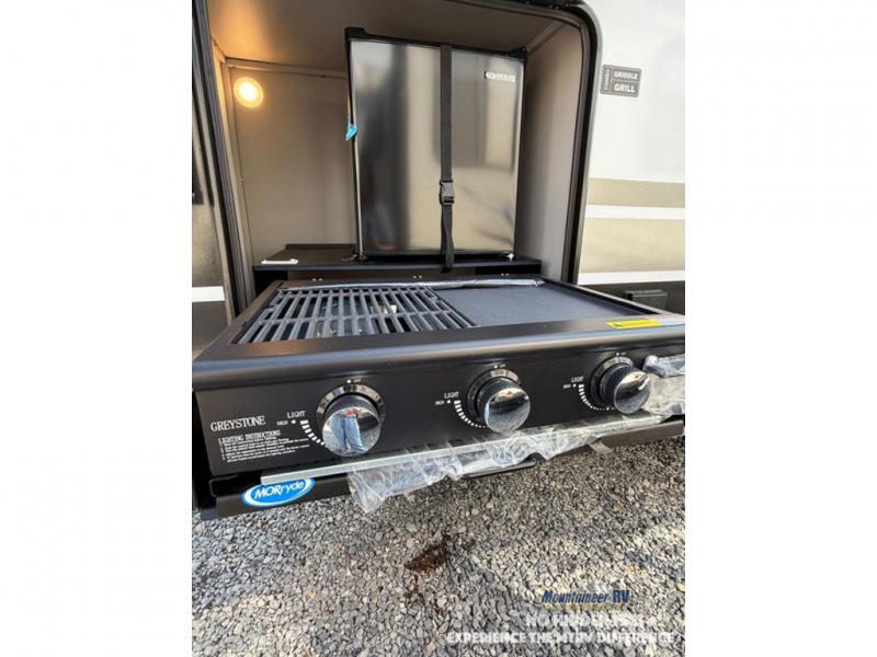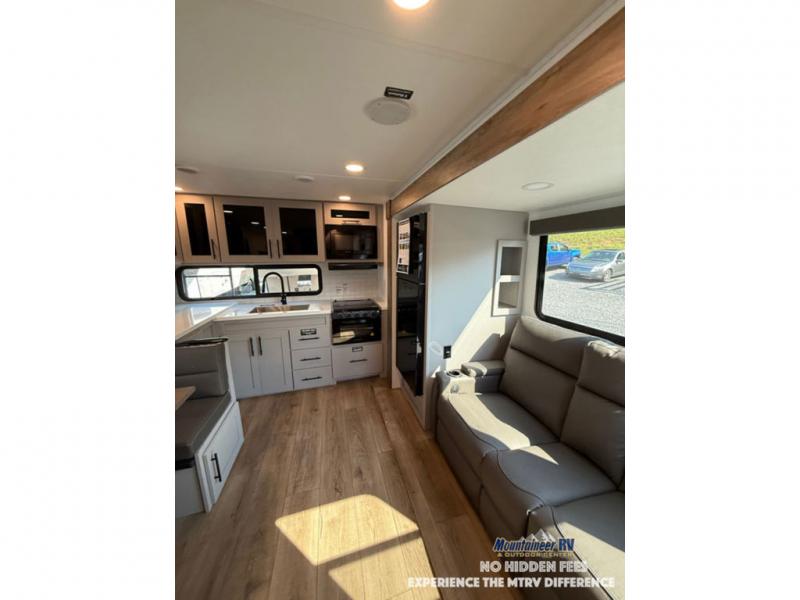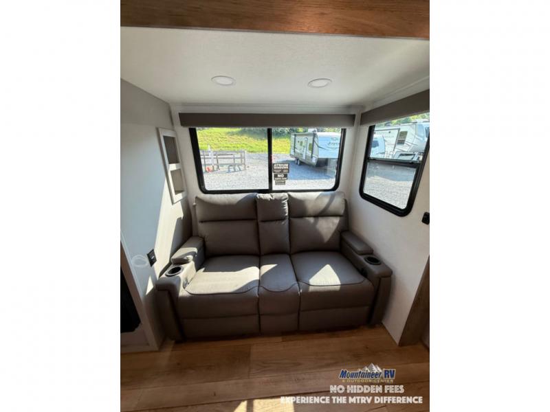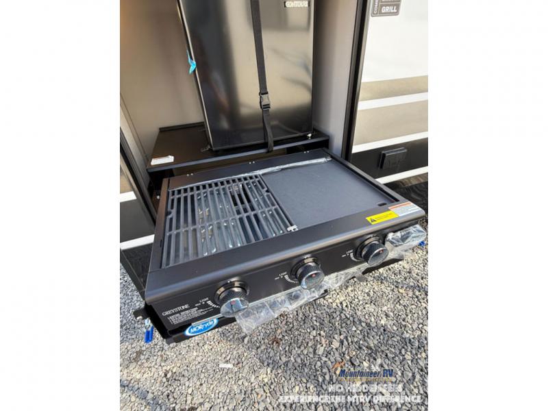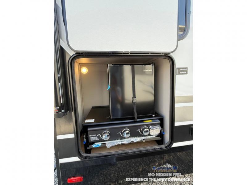 Head to your favorite camping spot in this double slide out travel trailer! You can set up the 19' awning when you arrive, then start lunch on the exterior griddle. There is also an exterior refrigerator for cold drinks! If the weather isn't cooperating, the rear kitchen includes generous counter space to prep meals and all the appliances needed. A booth dinette inside provides a place to dine together, or you can choose the optional table and chairs if you prefer that seating arrangement. You're sure to enjoy the theater seat in direct view of the 40" TV for movie nights, and when you're ready to call it a night, the queen bed in the front bedroom will provide a great night's rest.