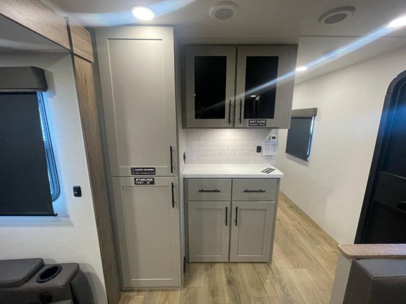 Head to your favorite camping spot in this double slide out travel trailer! You can set up the 19' awning when you arrive, then start lunch on the exterior griddle. There is also an exterior refrigerator for cold drinks! If the weather isn't cooperating, the rear kitchen includes generous counter space to prep meals and all the appliances needed. A booth dinette inside provides a place to dine together, or you can choose the optional table and chairs if you prefer that seating arrangement. You're sure to enjoy the theater seat in direct view of the 40" TV for movie nights, and when you're ready to call it a night, the queen bed in the front bedroom will provide a great night's rest.