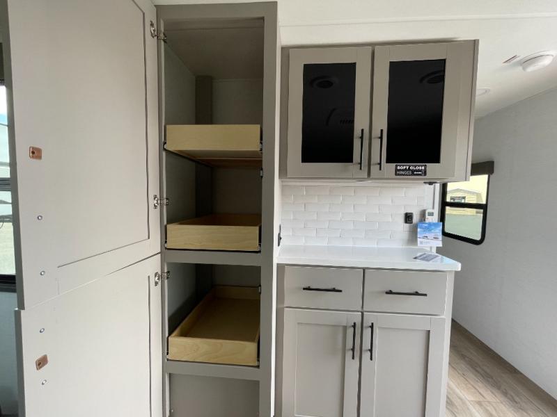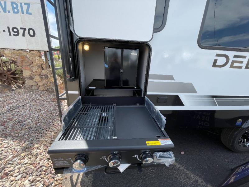 Head to your favorite camping spot in this double slide out travel trailer! You can set up the 19' awning when you arrive, then start lunch on the exterior griddle. There is also an exterior refrigerator for cold drinks! If the weather isn't cooperating, the rear kitchen includes generous counter space to prep meals and all the appliances needed. A booth dinette inside provides a place to dine together, or you can choose the optional table and chairs if you prefer that seating arrangement. You're sure to enjoy the theater seat in direct view of the 40" TV for movie nights, and when you're ready to call it a night, the queen bed in the front bedroom will provide a great night's rest.
