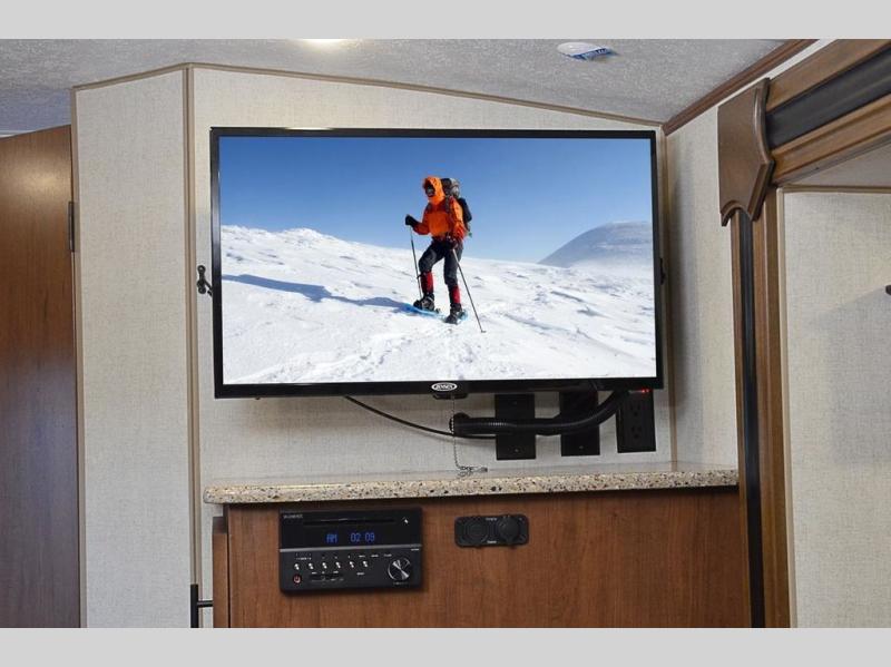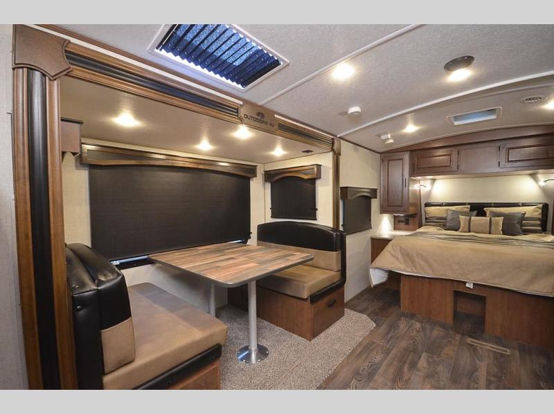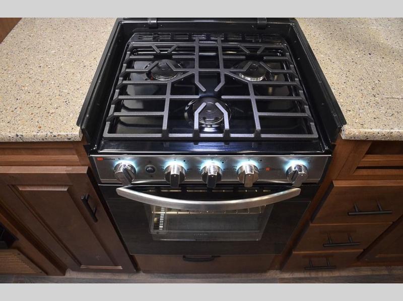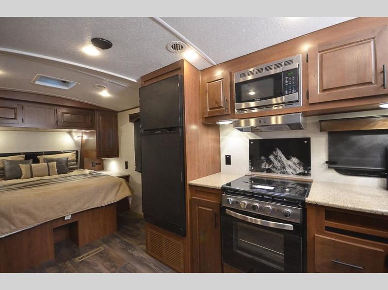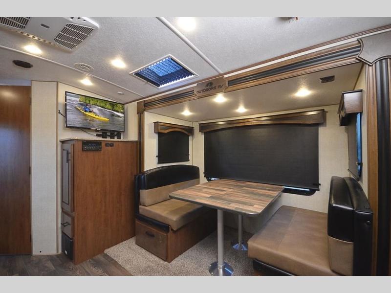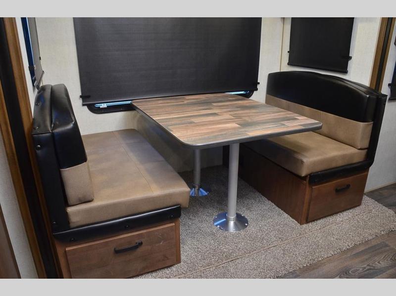 Head to your favorite camping spot in this double slide out travel trailer! You can set up the 19' awning when you arrive, then start lunch on the exterior griddle. There is also an exterior refrigerator for cold drinks! If the weather isn't cooperating, the rear kitchen includes generous counter space to prep meals and all the appliances needed. A booth dinette inside provides a place to dine together, or you can choose the optional table and chairs if you prefer that seating arrangement. You're sure to enjoy the theater seat in direct view of the 40" TV for movie nights, and when you're ready to call it a night, the queen bed in the front bedroom will provide a great night's rest.