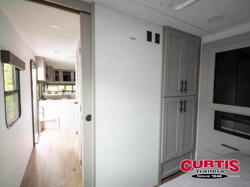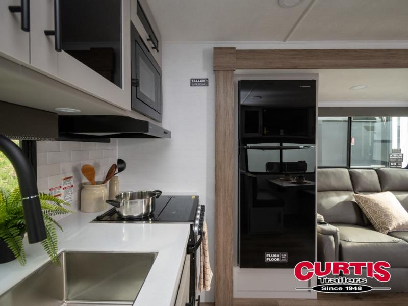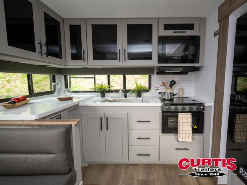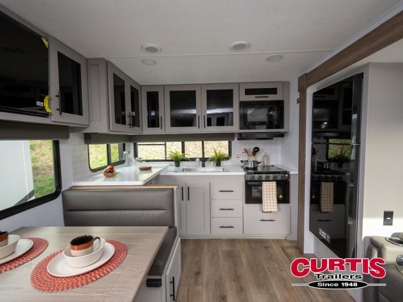 Head to your favorite camping spot in this double slide out travel trailer! You can set up the 19' awning when you arrive, then start lunch on the exterior griddle. There is also an exterior refrigerator for cold drinks! If the weather isn't cooperating, the rear kitchen includes generous counter space to prep meals and all the appliances needed. A booth dinette inside provides a place to dine together, or you can choose the optional table and chairs if you prefer that seating arrangement. You're sure to enjoy the theater seat in direct view of the 40" TV for movie nights, and when you're ready to call it a night, the queen bed in the front bedroom will provide a great night's rest.
