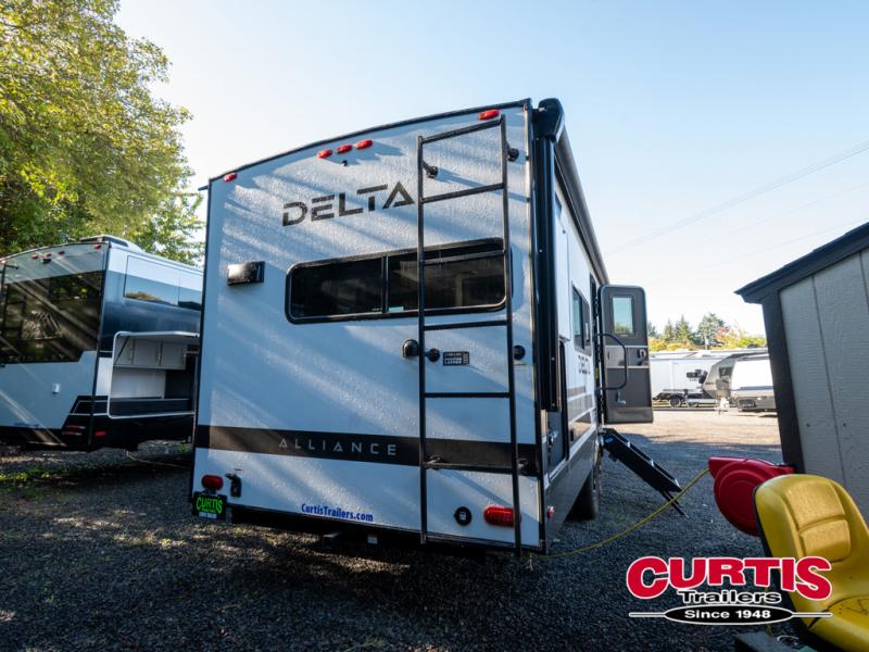 Form and function work together with every one of these Alliance RV Delta travel trailers! They are built with a walk-on roof with a seamless PVC roof covering, Mylar reinforced exterior seals, and a heated and enclosed underbelly to protect your unit. The commercial grade vinyl flooring will be easy to clean, and the oversized atrium windows throughout let in plenty of natural sunlight. With 62 cu. ft. of drop frame pass-through storage, you can bring along all of your essential camping gear plus it has USB charging for more convenience. There are many at home interior conveniences including a Bluetooth speaker, USB charging throughout, and even a pull-out kitchen trash can. Come find your favorite model today!