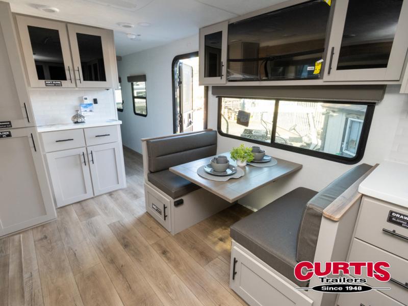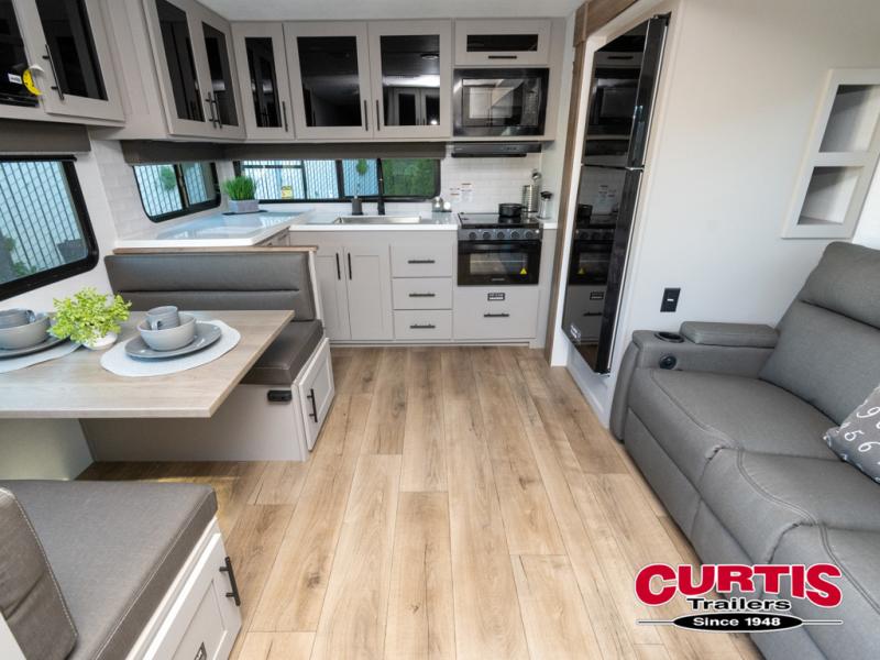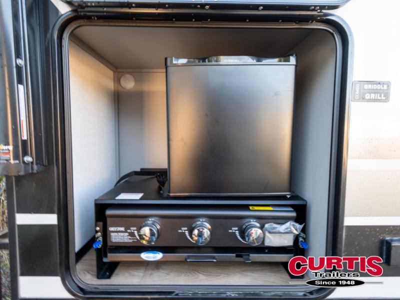 Head to your favorite camping spot in this double slide out travel trailer! You can set up the 19' awning when you arrive, then start lunch on the exterior griddle. There is also an exterior refrigerator for cold drinks! If the weather isn't cooperating, the rear kitchen includes generous counter space to prep meals and all the appliances needed. A booth dinette inside provides a place to dine together, or you can choose the optional table and chairs if you prefer that seating arrangement. You're sure to enjoy the theater seat in direct view of the 40" TV for movie nights, and when you're ready to call it a night, the queen bed in the front bedroom will provide a great night's rest.