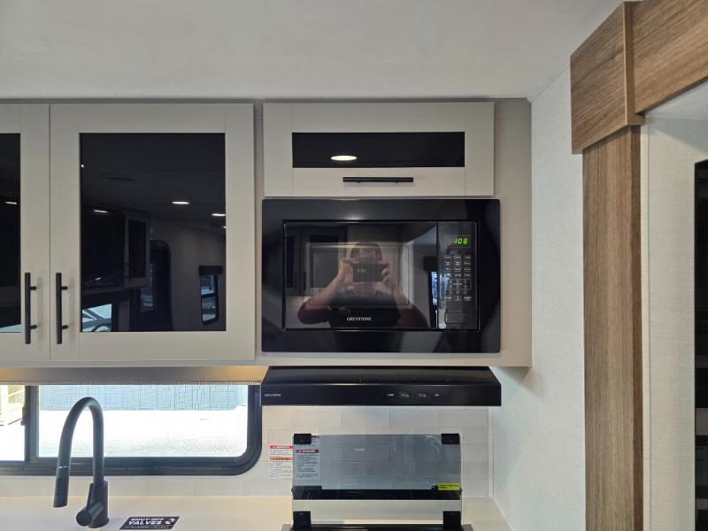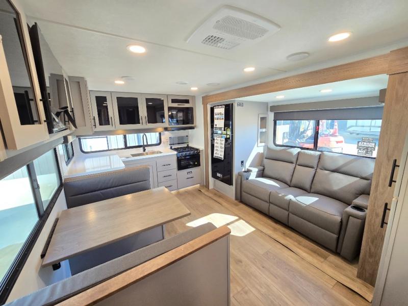 Head to your favorite camping spot in this double slide out travel trailer! You can set up the 19' awning when you arrive, then start lunch on the exterior griddle. There is also an exterior refrigerator for cold drinks! If the weather isn't cooperating, the rear kitchen includes generous counter space to prep meals and all the appliances needed. A booth dinette inside provides a place to dine together, or you can choose the optional table and chairs if you prefer that seating arrangement. You're sure to enjoy the theater seat in direct view of the 40" TV for movie nights, and when you're ready to call it a night, the queen bed in the front bedroom will provide a great night's rest.