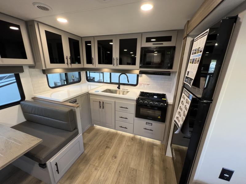 Head to your favorite camping spot in this double slide out travel trailer! You can set up the 19' awning when you arrive, then start lunch on the exterior griddle. There is also an exterior refrigerator for cold drinks! If the weather isn't cooperating, the rear kitchen includes generous counter space to prep meals and all the appliances needed. A booth dinette inside provides a place to dine together, or you can choose the optional table and chairs if you prefer that seating arrangement. You're sure to enjoy the theater seat in direct view of the 40" TV for movie nights, and when you're ready to call it a night, the queen bed in the front bedroom will provide a great night's rest.