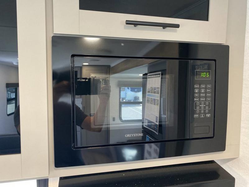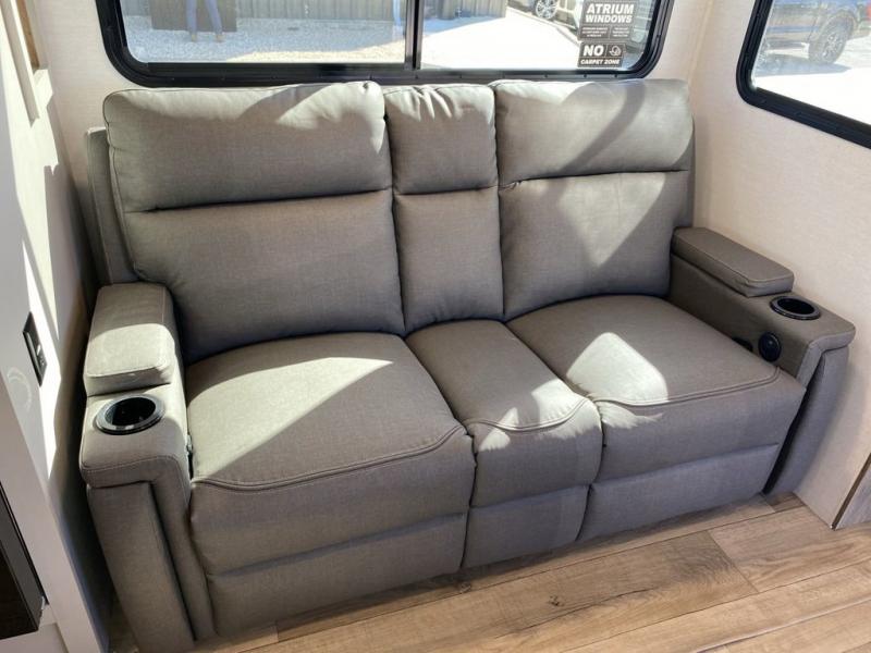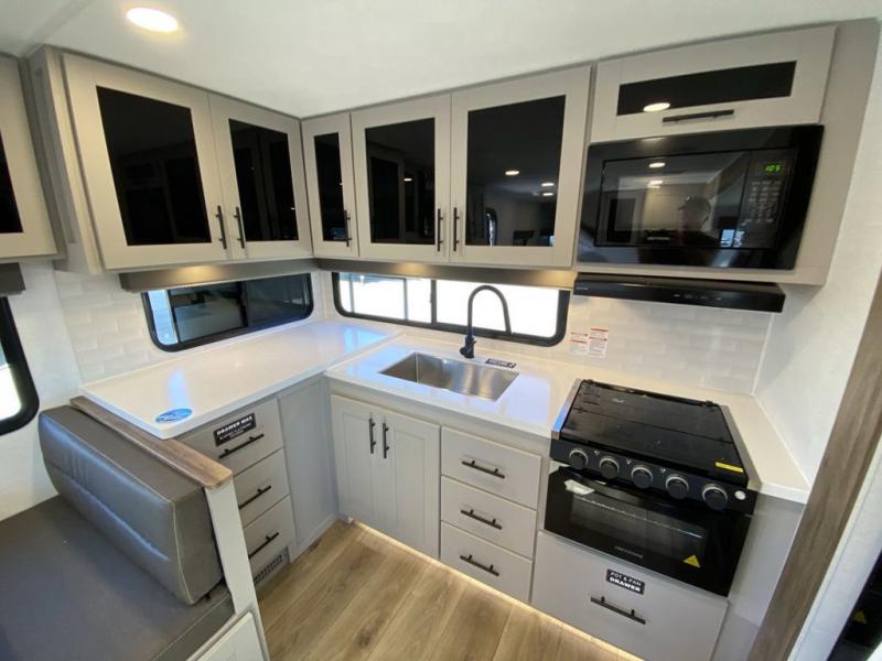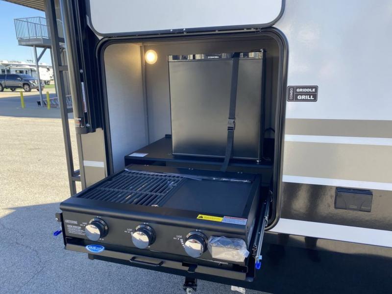 Head to your favorite camping spot in this double slide out travel trailer! You can set up the 19' awning when you arrive, then start lunch on the exterior griddle. There is also an exterior refrigerator for cold drinks! If the weather isn't cooperating, the rear kitchen includes generous counter space to prep meals and all the appliances needed. A booth dinette inside provides a place to dine together, or you can choose the optional table and chairs if you prefer that seating arrangement. You're sure to enjoy the theater seat in direct view of the 40" TV for movie nights, and when you're ready to call it a night, the queen bed in the front bedroom will provide a great night's rest.