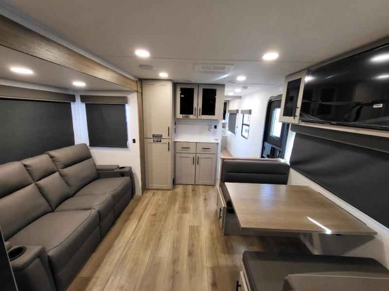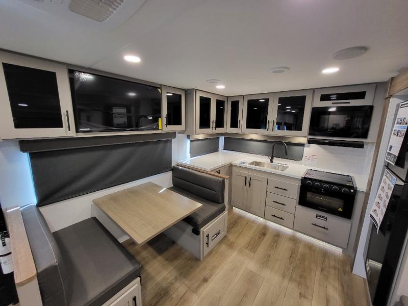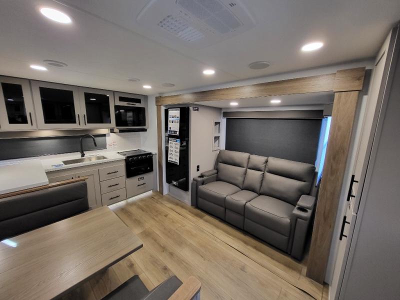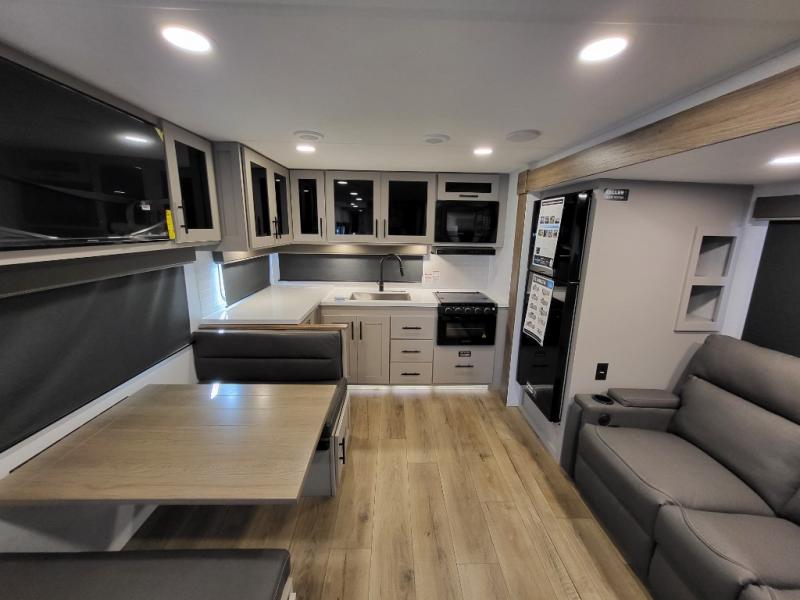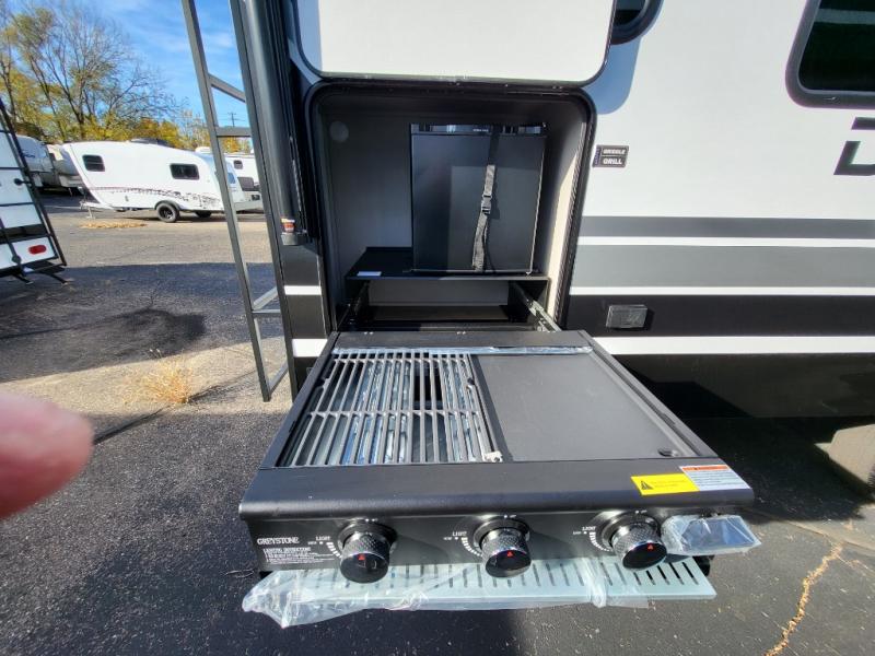 Head to your favorite camping spot in this double slide out travel trailer! You can set up the 19' awning when you arrive, then start lunch on the exterior griddle. There is also an exterior refrigerator for cold drinks! If the weather isn't cooperating, the rear kitchen includes generous counter space to prep meals and all the appliances needed. A booth dinette inside provides a place to dine together, or you can choose the optional table and chairs if you prefer that seating arrangement. You're sure to enjoy the theater seat in direct view of the 40" TV for movie nights, and when you're ready to call it a night, the queen bed in the front bedroom will provide a great night's rest.