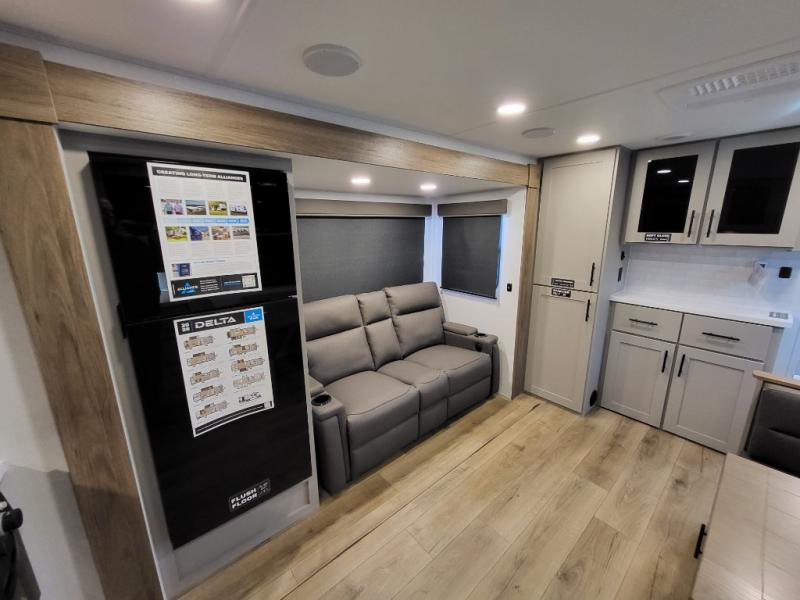 Form and function work together with every one of these Alliance RV Delta travel trailers! They are built with a walk-on roof with a seamless PVC roof covering, Mylar reinforced exterior seals, and a heated and enclosed underbelly to protect your unit. The commercial grade vinyl flooring will be easy to clean, and the oversized atrium windows throughout let in plenty of natural sunlight. With 62 cu. ft. of drop frame pass-through storage, you can bring along all of your essential camping gear plus it has USB charging for more convenience. There are many at home interior conveniences including a Bluetooth speaker, USB charging throughout, and even a pull-out kitchen trash can. Come find your favorite model today!