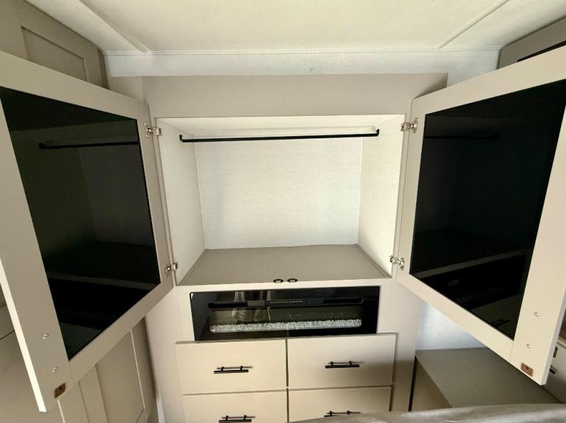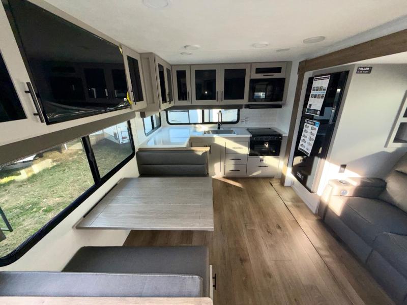 Head to your favorite camping spot in this double slide out travel trailer! You can set up the 19' awning when you arrive, then start lunch on the exterior griddle. There is also an exterior refrigerator for cold drinks! If the weather isn't cooperating, the rear kitchen includes generous counter space to prep meals and all the appliances needed. A booth dinette inside provides a place to dine together, or you can choose the optional table and chairs if you prefer that seating arrangement. You're sure to enjoy the theater seat in direct view of the 40" TV for movie nights, and when you're ready to call it a night, the queen bed in the front bedroom will provide a great night's rest.