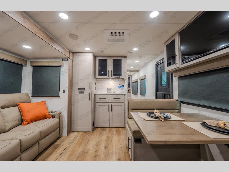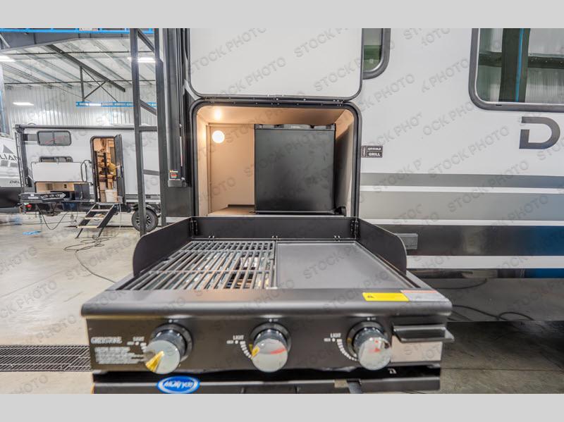 Head to your favorite camping spot in this double slide out travel trailer! You can set up the 19' awning when you arrive, then start lunch on the exterior griddle. There is also an exterior refrigerator for cold drinks! If the weather isn't cooperating, the rear kitchen includes generous counter space to prep meals and all the appliances needed. A booth dinette inside provides a place to dine together, or you can choose the optional table and chairs if you prefer that seating arrangement. You're sure to enjoy the theater seat in direct view of the 40" TV for movie nights, and when you're ready to call it a night, the queen bed in the front bedroom will provide a great night's rest. You also have a wardrobe/nightstand at each side for storing clothing and essentials.