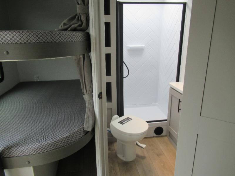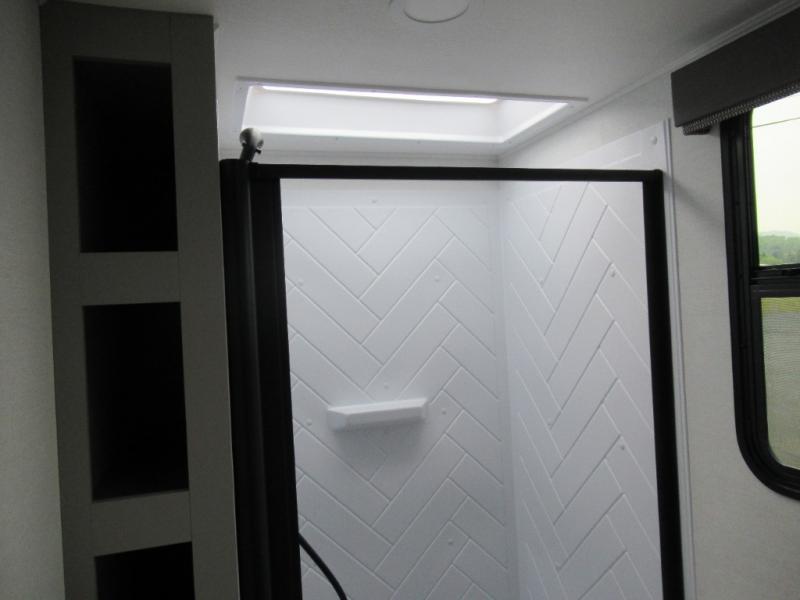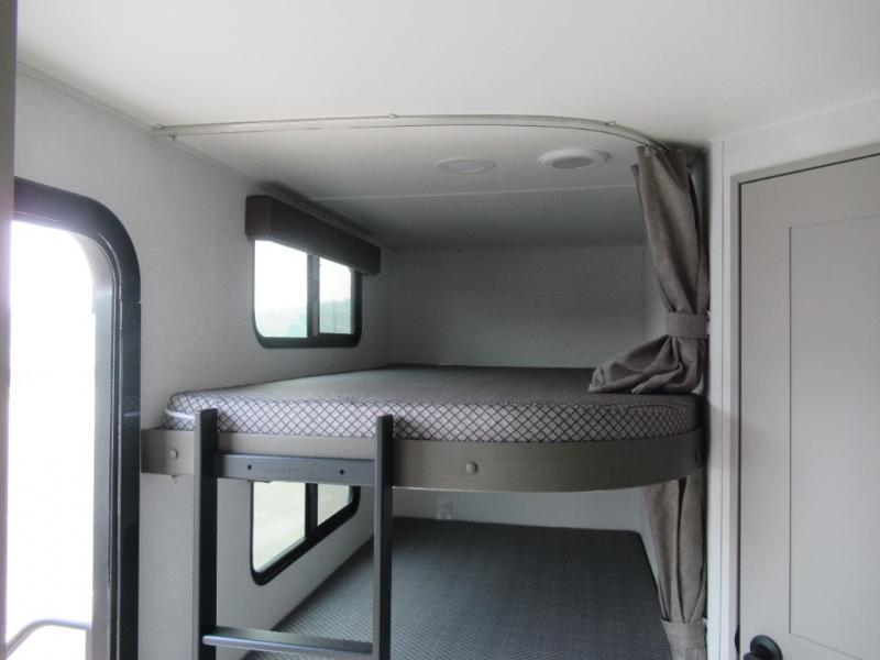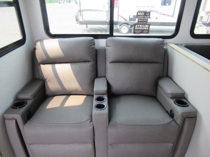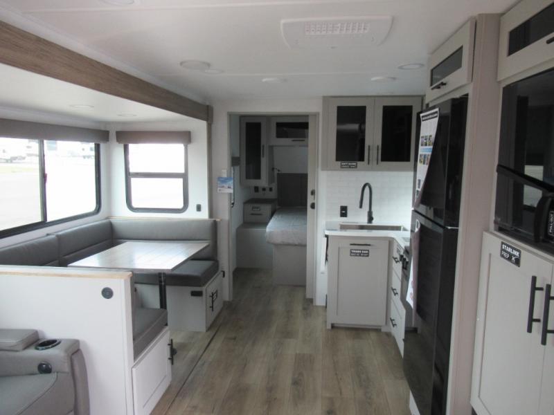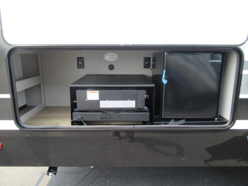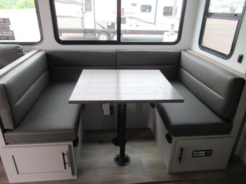 The perfect travel trailer for a larger family or one that enjoys traveling with friends! One large slide opens up the interior living space nice and features a U-shaped dinette and theater seating to provide plenty of seating for everyone. Enjoy the 40" HDTV opposite the seating for a movie indoors, and game night will be easy with everyone at the dinette which can also be converted for added sleeping if needed. The double entry doors will make loading and unloading simple, and allows you to easily slip in and out of the private bedroom for a morning walk. You can easily prepare all of your favorite meals and snacks with the kitchen amenities provided inside. A three burner range allows you to easily cook indoors, or you can enjoy cooking outside using the outdoor griddle/grill if you like. There is a 10 cu. ft. 12V refrigerator to keep all of your perishables and drinks nice and cold, plus a large sink for dishes and cleaning up, and there is also a flip-up counter extension for more prep space. You will also appreciate the rear corner bath featuring a 30" x 36" shower, vanity with sink, soft close porcelain toilet with foot flush, and linen cabinet for your towels.