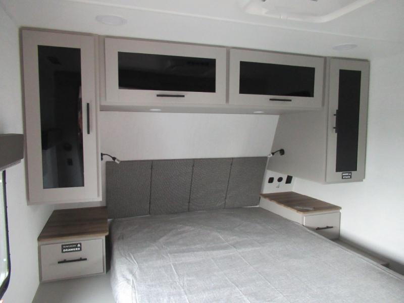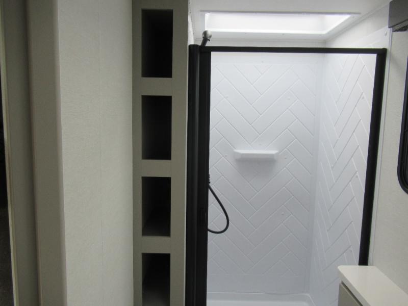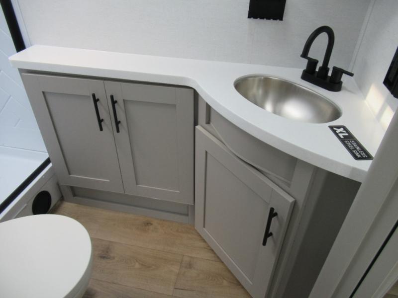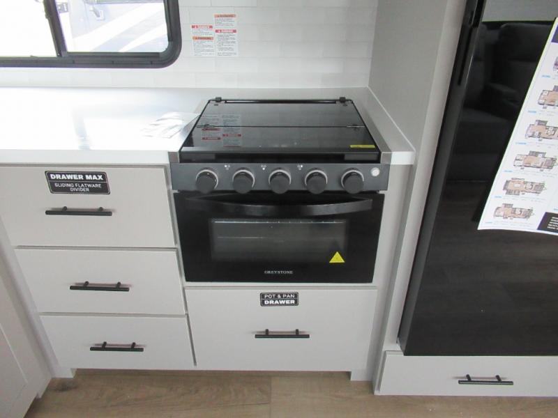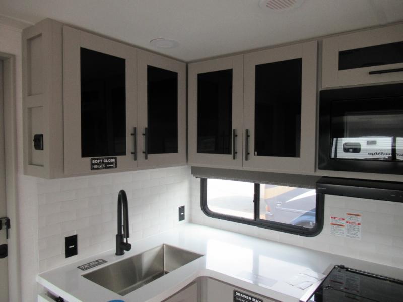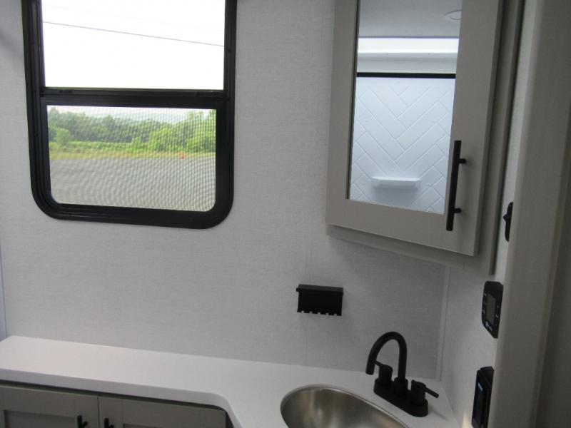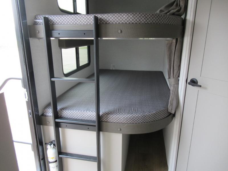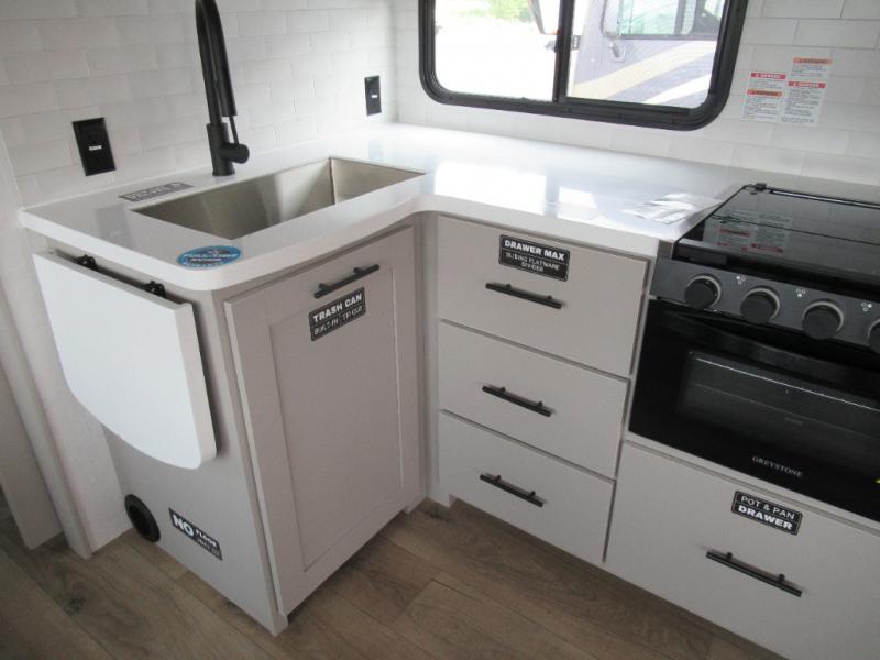 The perfect travel trailer for a larger family or one that enjoys traveling with friends! One large slide opens up the interior living space nice and features a U-shaped dinette and theater seating to provide plenty of seating for everyone. Enjoy the 40" HDTV opposite the seating for a movie indoors, and game night will be easy with everyone at the dinette which can also be converted for added sleeping if needed. The double entry doors will make loading and unloading simple, and allows you to easily slip in and out of the private bedroom for a morning walk. You can easily prepare all of your favorite meals and snacks with the kitchen amenities provided inside. A three burner range allows you to easily cook indoors, or you can enjoy cooking outside using the outdoor griddle/grill if you like. There is a 10 cu. ft. 12V refrigerator to keep all of your perishables and drinks nice and cold, plus a large sink for dishes and cleaning up, and there is also a flip-up counter extension for more prep space. You will also appreciate the rear corner bath featuring a 30" x 36" shower, vanity with sink, soft close porcelain toilet with foot flush, and linen cabinet for your towels.