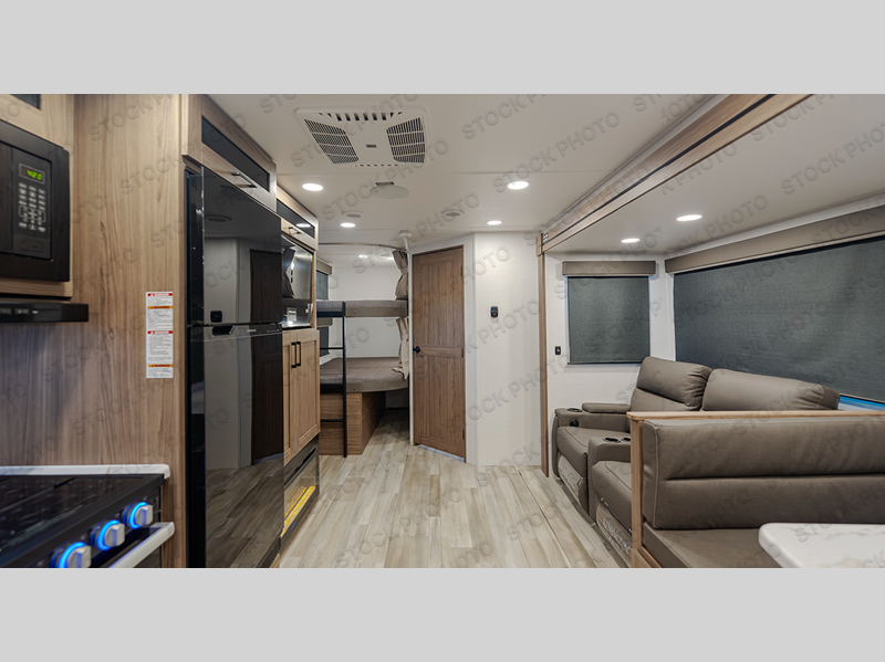 The perfect travel trailer for a larger family or one that enjoys traveling with friends! One large slide opens up the interior living space nice and features a U-shaped dinette and theater seating to provide plenty of seating for everyone. Enjoy the 40" HDTV opposite the seating for a movie indoors, and game night will be easy with everyone at the dinette which can also be converted for added sleeping if needed. The double entry doors will make loading and unloading simple, and allows you to easily slip in and out of the private bedroom for a morning walk. You can easily prepare all of your favorite meals and snacks with the kitchen amenities provided inside. A three burner range allows you to easily cook indoors, or you can enjoy cooking outside using the outdoor griddle/grill if you like. There is a 10 cu. ft. 12V refrigerator to keep all of your perishables and drinks nice and cold, plus a large sink for dishes and cleaning up, and there is also a flip-up counter extension for more prep space. You will also appreciate the rear corner bath featuring a 30" x 36" shower, vanity with sink, soft close porcelain toilet with foot flush, and linen cabinet for your towels.