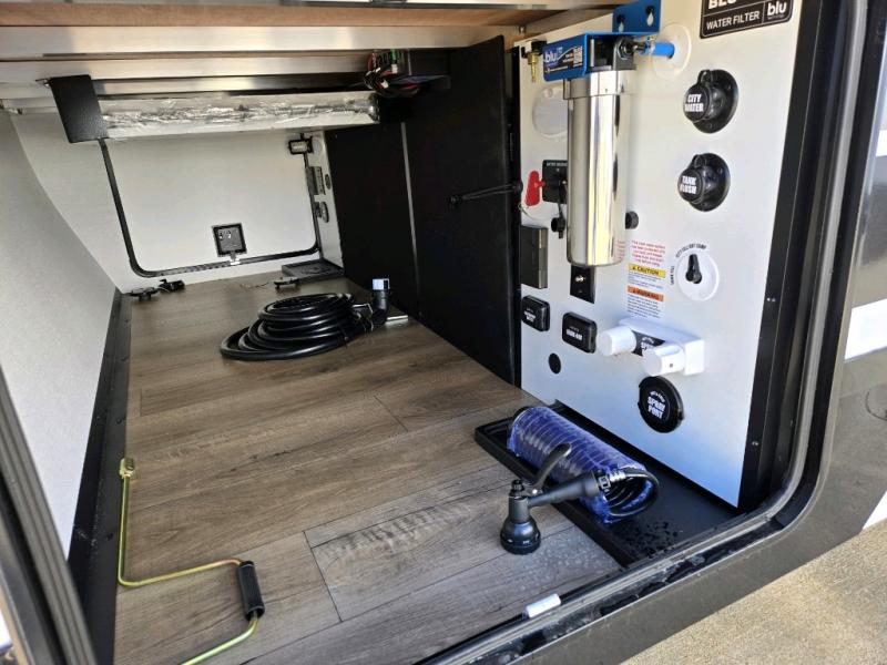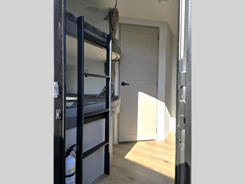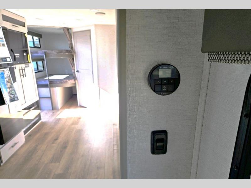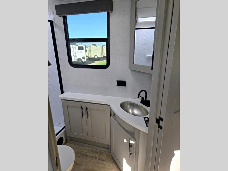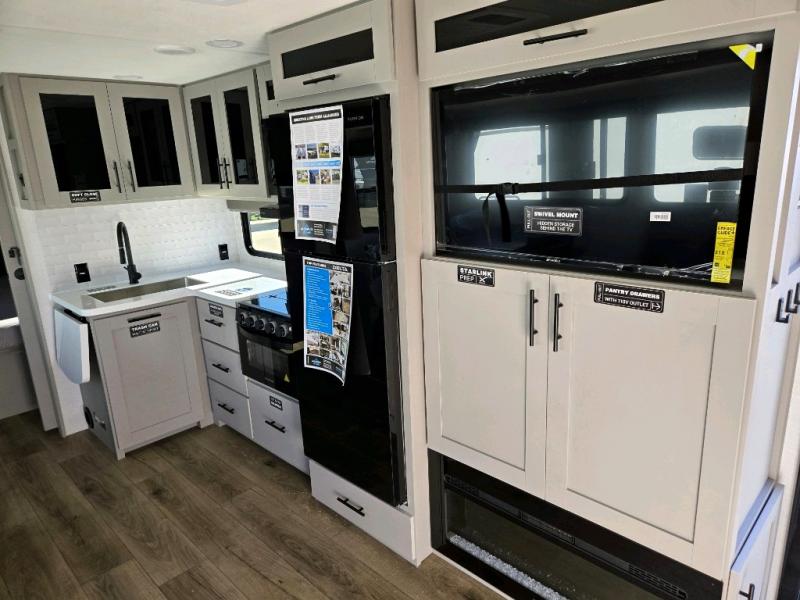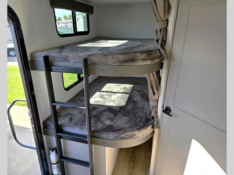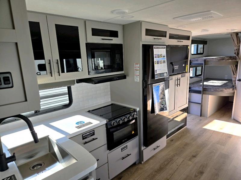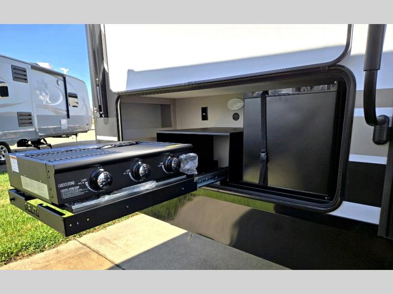 The perfect travel trailer for a larger family or one that enjoys traveling with friends! One large slide opens up the interior living space nice and features a U-shaped dinette and theater seating to provide plenty of seating for everyone. Enjoy the 40" HDTV opposite the seating for a movie indoors, and game night will be easy with everyone at the dinette which can also be converted for added sleeping if needed. The double entry doors will make loading and unloading simple and allows you to easily slip in and out of the private bedroom for a morning walk. You can easily prepare all of your favorite meals and snacks with the kitchen amenities provided inside. A three-burner range allows you to easily cook indoors, or you can enjoy cooking outside using the outdoor griddle/grill if you like. There is a 10-cu. ft. 12V refrigerator to keep all of your perishables and drinks nice and cold, plus a large sink for dishes and cleaning up, and there is also a flip-up counter extension for more prep space. You will also appreciate the rear corner bath featuring a 30" x 36" shower, vanity with sink, soft close porcelain toilet with foot flush, and linen cabinet for your towels.