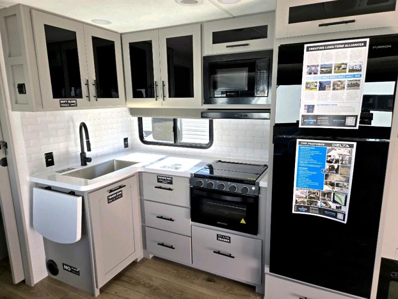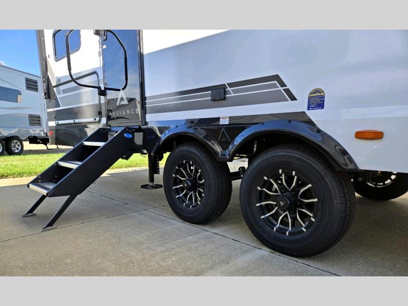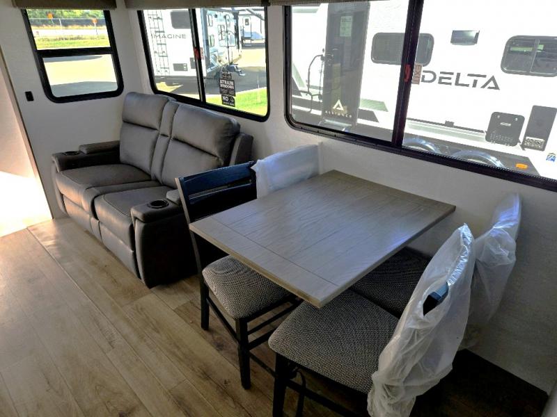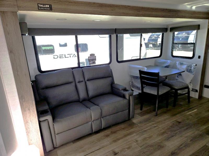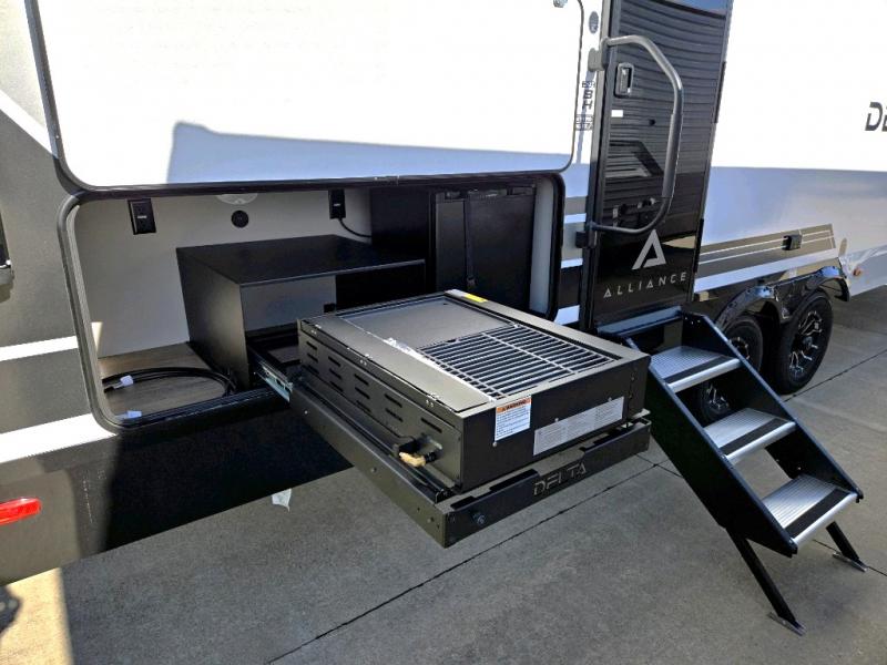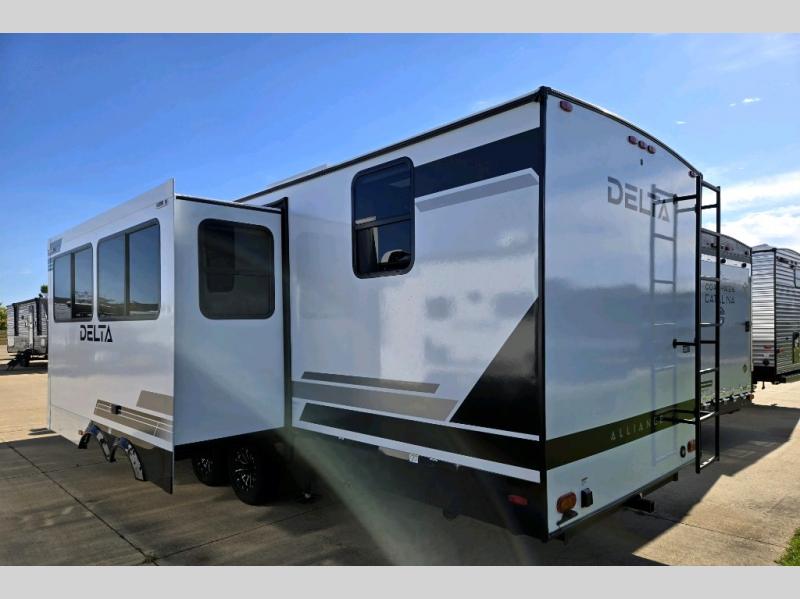 Form and function work together with every one of these Alliance RV Delta travel trailers! They are built with a walk-on roof with a seamless PVC roof covering, Mylar reinforced exterior seals, and a heated and enclosed underbelly to protect your unit. The commercial grade vinyl flooring will be easy to clean, and the oversized atrium windows throughout let in plenty of natural sunlight. With 62 cu. ft. of drop frame pass-through storage, you can bring along all of your essential camping gear plus it has USB charging for more convenience. There are many at home interior conveniences including a Bluetooth speaker, USB charging throughout, and even a pull-out kitchen trash can. Come find your favorite model today!