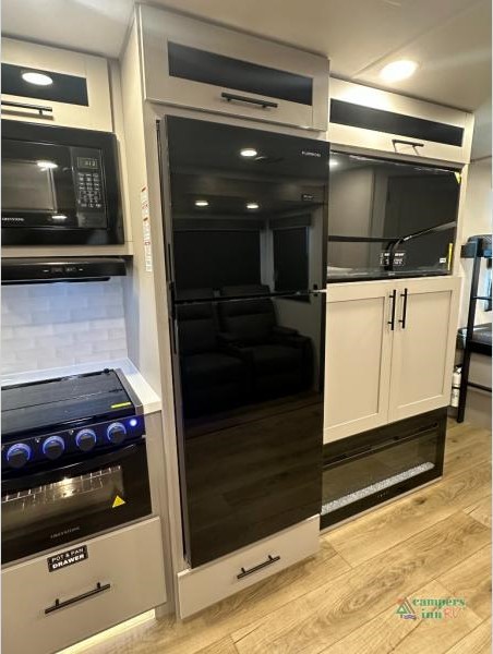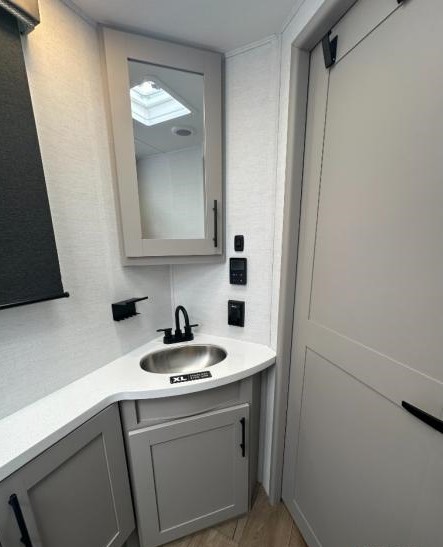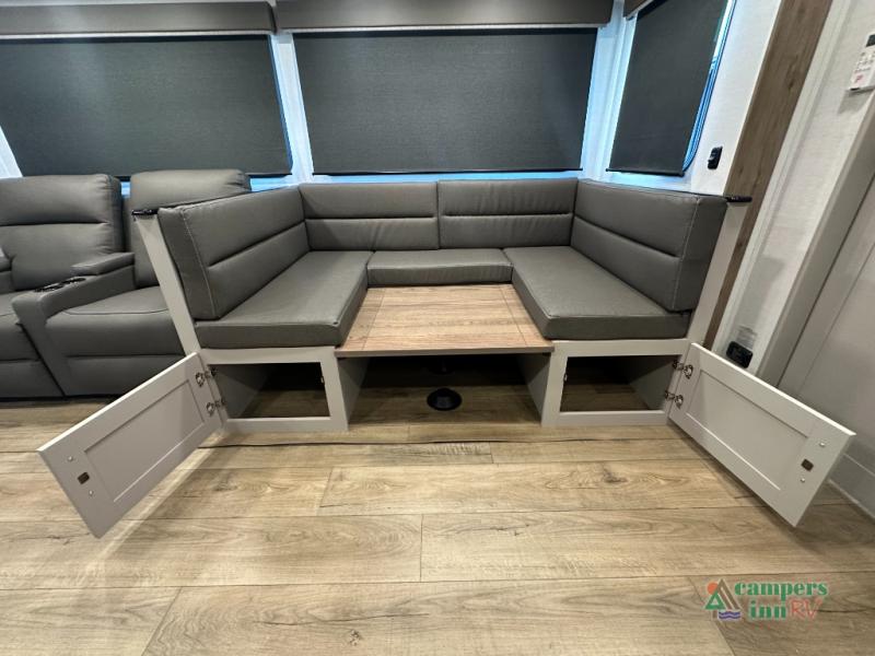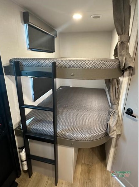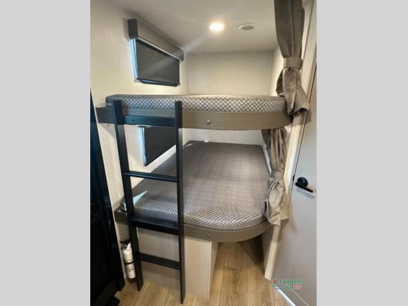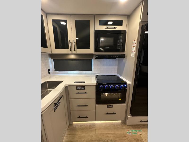 The perfect travel trailer for a larger family or one that enjoys traveling with friends! One large slide opens up the interior living space nice and features a U-shaped dinette and theater seating to provide plenty of seating for everyone. Enjoy the 40" HDTV opposite the seating for a movie indoors, and game night will be easy with everyone at the dinette which can also be converted for added sleeping if needed. The double entry doors will make loading and unloading simple and allows you to easily slip in and out of the private bedroom for a morning walk. You can easily prepare all of your favorite meals and snacks with the kitchen amenities provided inside. A three-burner range allows you to easily cook indoors, or you can enjoy cooking outside using the outdoor griddle/grill if you like. There is a 10-cu. ft. 12V refrigerator to keep all of your perishables and drinks nice and cold, plus a large sink for dishes and cleaning up, and there is also a flip-up counter extension for more prep space. You will also appreciate the rear corner bath featuring a 30" x 36" shower, vanity with sink, soft close porcelain toilet with foot flush, and linen cabinet for your towels.