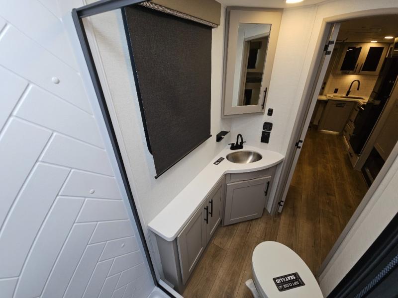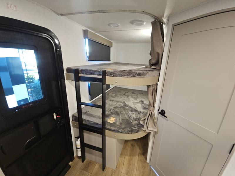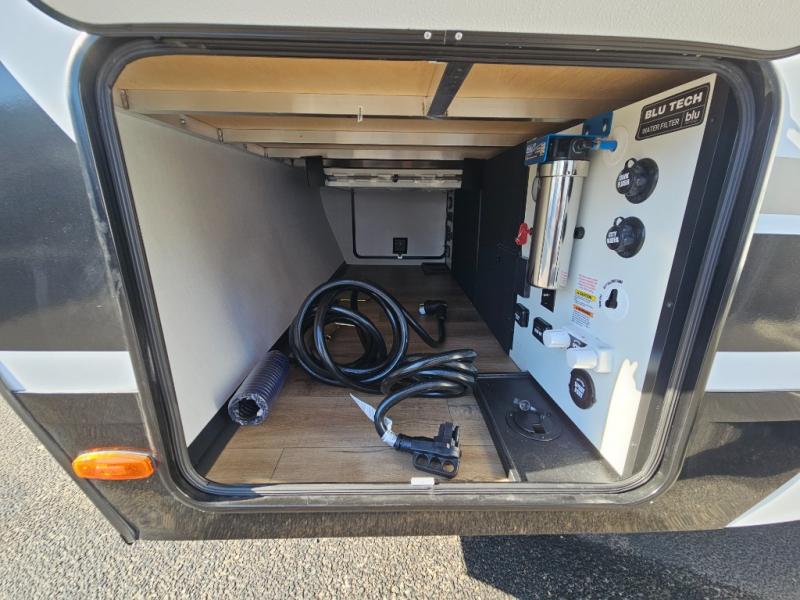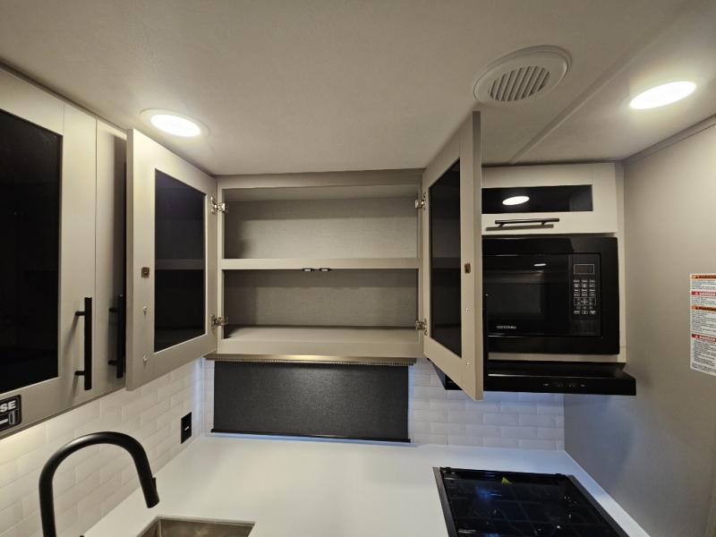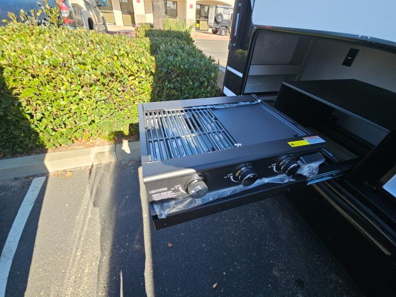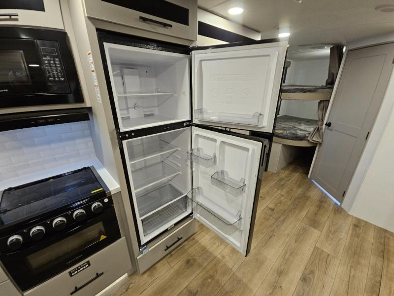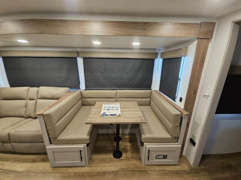 The perfect travel trailer for a larger family or one that enjoys traveling with friends! One large slide opens up the interior living space nice and features a U-shaped dinette and theater seating to provide plenty of seating for everyone. Enjoy the 40" HDTV opposite the seating for a movie indoors, and game night will be easy with everyone at the dinette which can also be converted for added sleeping if needed. The double entry doors will make loading and unloading simple and allows you to easily slip in and out of the private bedroom for a morning walk. You can easily prepare all of your favorite meals and snacks with the kitchen amenities provided inside. A three-burner range allows you to easily cook indoors, or you can enjoy cooking outside using the outdoor griddle/grill if you like. There is a 10-cu. ft. 12V refrigerator to keep all of your perishables and drinks nice and cold, plus a large sink for dishes and cleaning up, and there is also a flip-up counter extension for more prep space. You will also appreciate the rear corner bath featuring a 30" x 36" shower, vanity with sink, soft close porcelain toilet with foot flush, and linen cabinet for your towels.