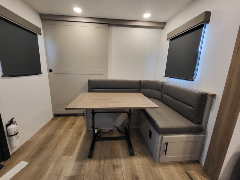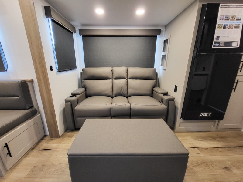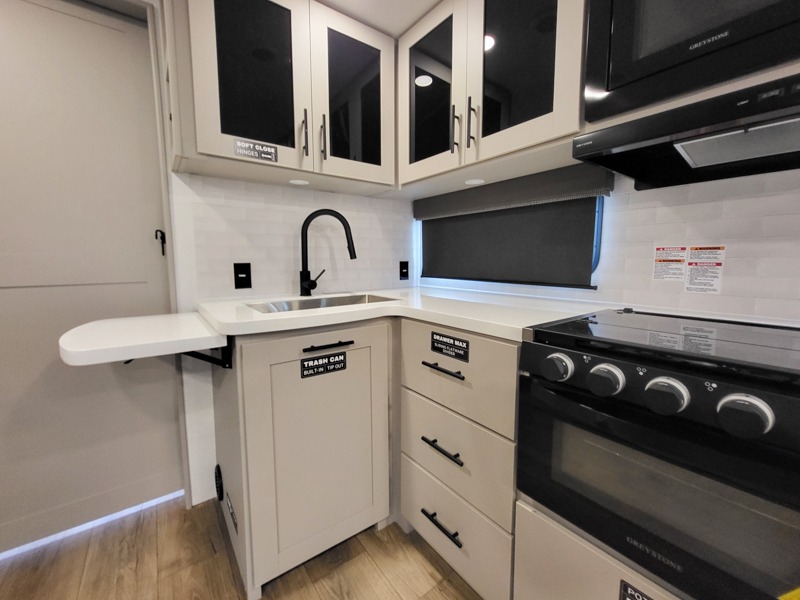 Moving forward into the living space, a large slide-out housing a U-shaped dinette and theater-style seating expands to create comfort and room to relax. The entertainment center opposite includes a 40? HDTV on a swivel arm and a Bluetooth speaker system, making it a great movie or game-night spot . The adjoining kitchen delivers a 10?cu?ft?12?V refrigerator, three-burner stove, a deep sink with flip-up counter extension, and pull-out pantry trays—with LED accent lighting and roller shades throughout for a refined feel.