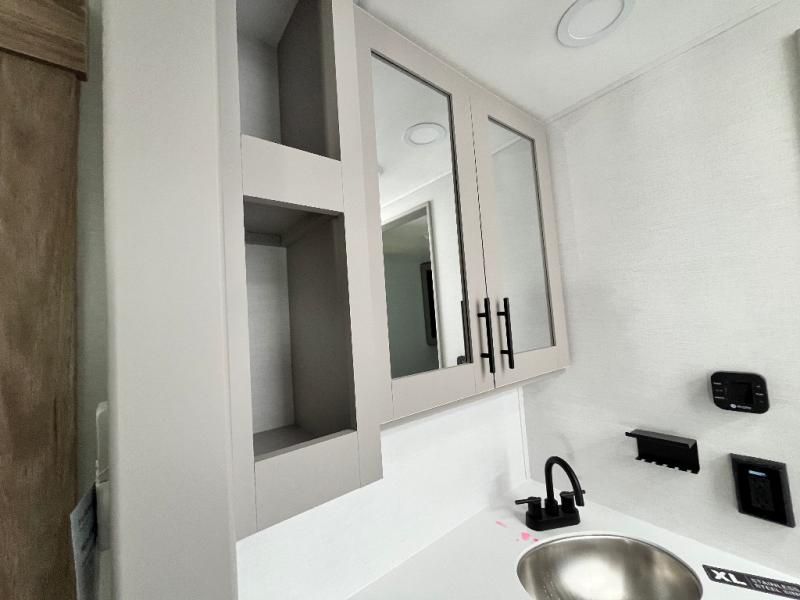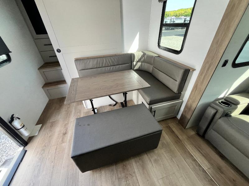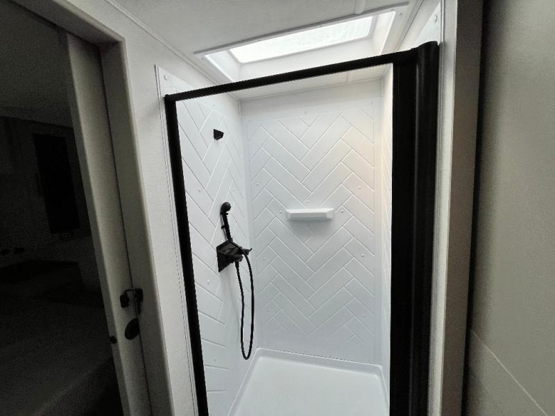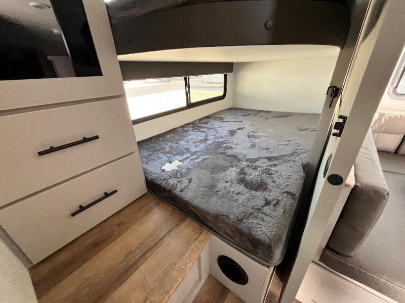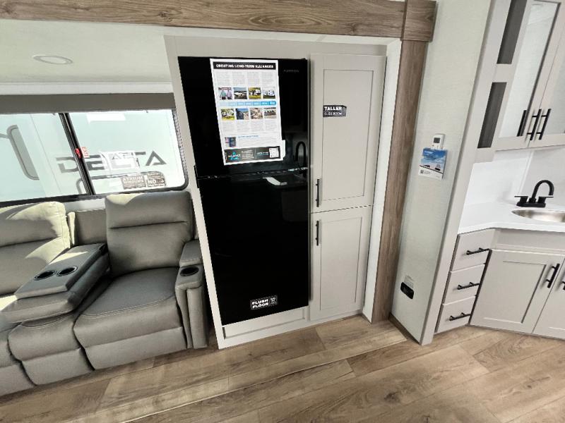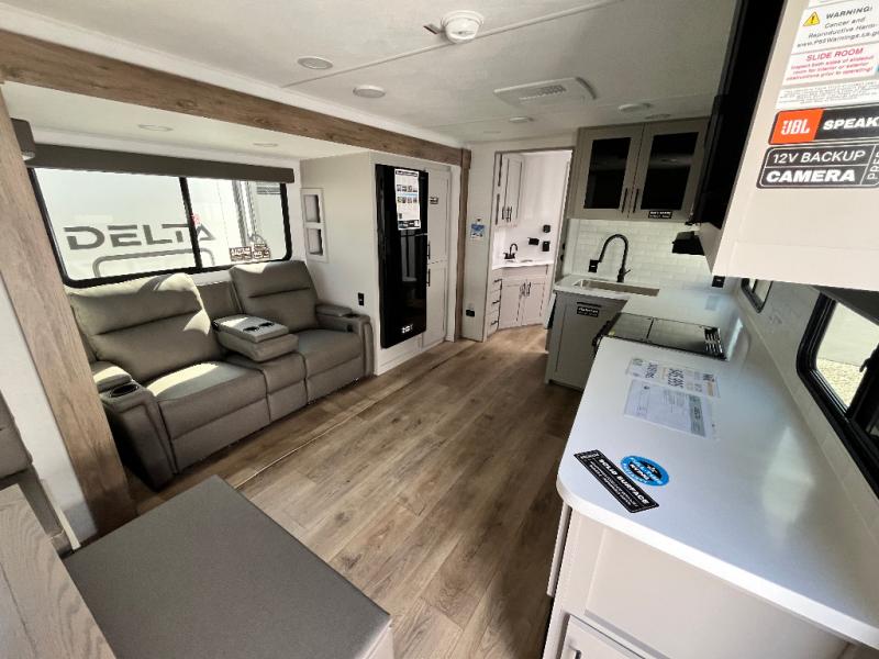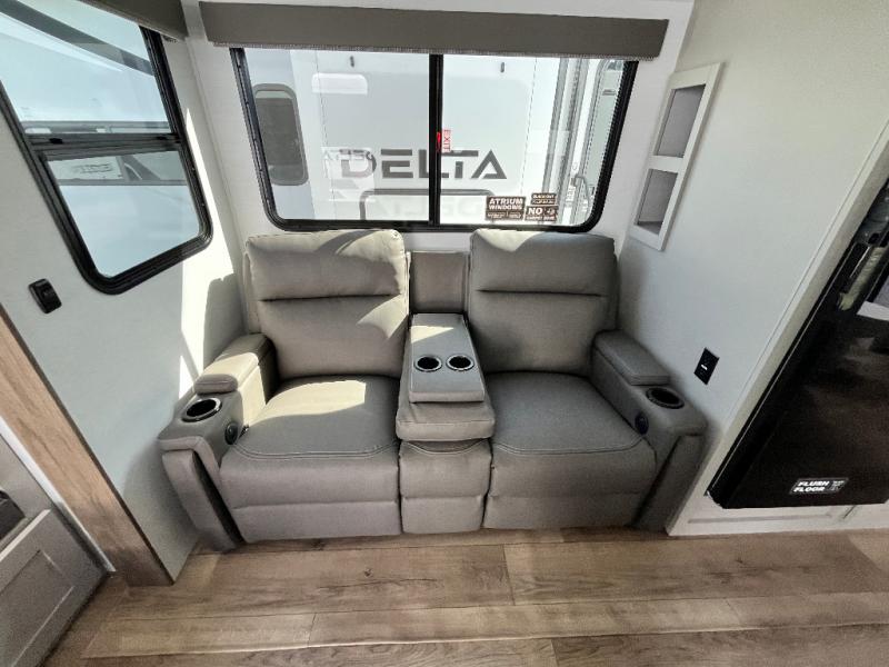This Delta 291BH model offers a thoughtfully designed layout perfect for comfort and convenience on the road. At the front, you'll find a private bedroom featuring two nightstand wardrobes, and additional overhead storage for all your essentials. Moving through the walk-through bathroom, enjoy a 30" x 36" shower and a soft-close porcelain toilet with foot flush. The central living area is ideal for relaxing or entertaining, with a 68" theater seat that has the option to be a tri-fold sleeper sofa for added sleeping space if needed. Along with a L-shaped dinette, and a 36" ottoman, all centered around a 40" TV. At the rear we have, two 46" x 74" bunks with steps that provide extra-sleeping space and easy accessibility along with a wardrobe for added storage, making this RV perfect for families or group travel.