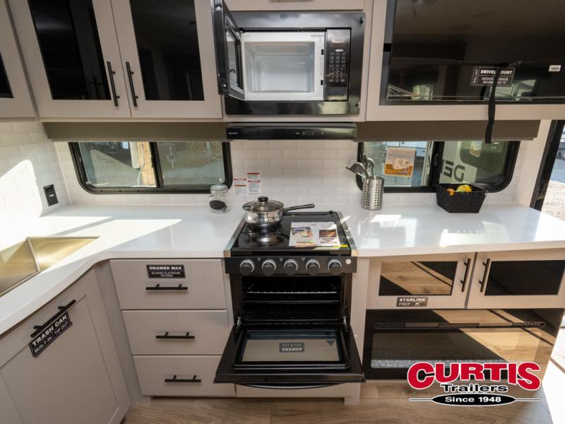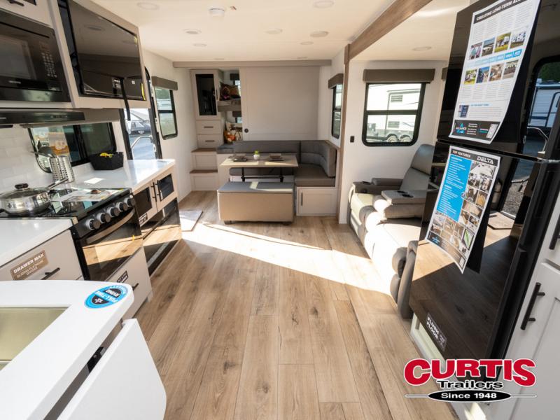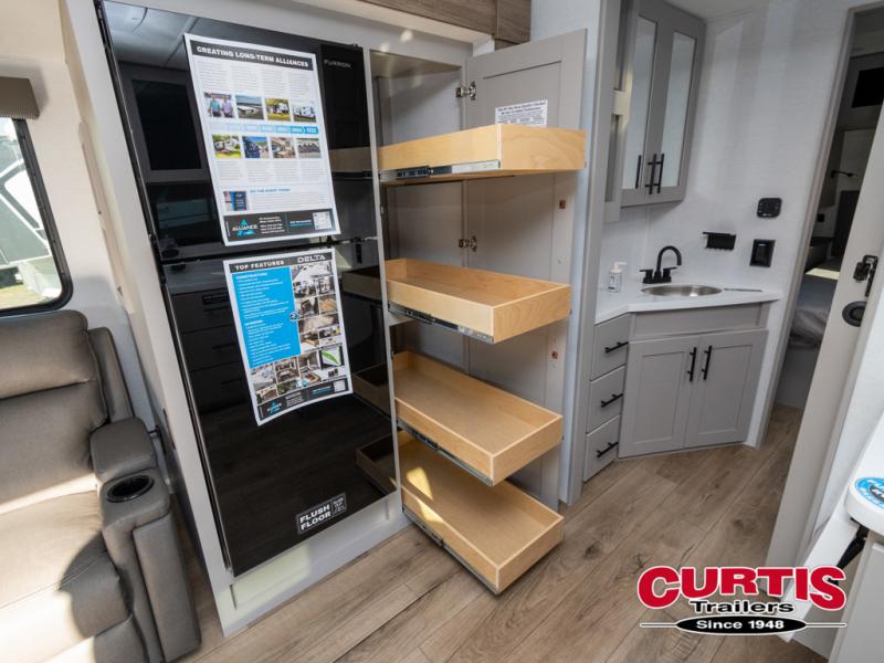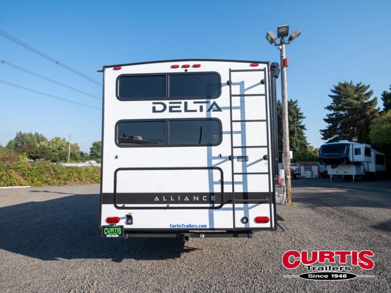 Form and function work together with every one of these Alliance RV Delta travel trailers! They are built with a walk-on roof with a seamless PVC roof covering, Mylar reinforced exterior seals, and a heated and enclosed underbelly to protect your unit. The commercial grade vinyl flooring will be easy to clean, and the oversized atrium windows throughout let in plenty of natural sunlight. With 62 cu. ft. of drop frame pass-through storage, you can bring along all of your essential camping gear plus it has USB charging for more convenience. There are many at home interior conveniences including a Bluetooth speaker, USB charging throughout, and even a pull-out kitchen trash can. Come find your favorite model today!