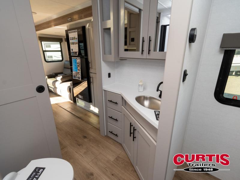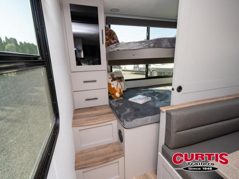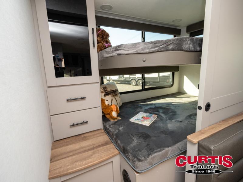 This Delta 291BH model offers a thoughtfully designed layout perfect for comfort and convenience on the road. At the front, you'll find a private bedroom featuring two nightstand wardrobes, and additional overhead storage for all your essentials. Moving through the walk-through bathroom, enjoy a 30" x 36" shower and a soft-close porcelain toilet with foot flush. The central living area is ideal for relaxing or entertaining, with a 68" theater seat that has the option to be a tri-fold sleeper sofa for added sleeping space if needed. Along with a L-shaped dinette, and a 36" ottoman, all centered around a 40" TV. At the rear we have, two 46" x 74" bunks with steps that provide extra-sleeping space and easy accessibility along with a wardrobe for added storage, making this RV perfect for families or group travel.